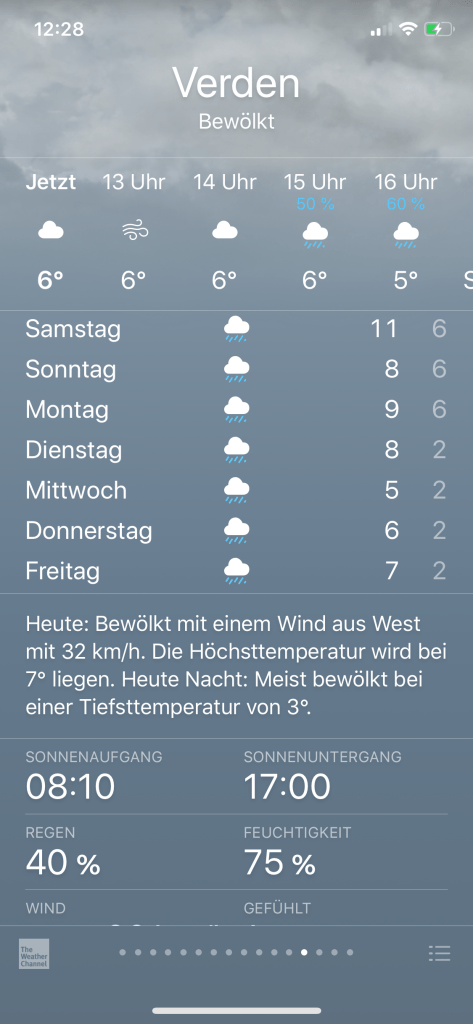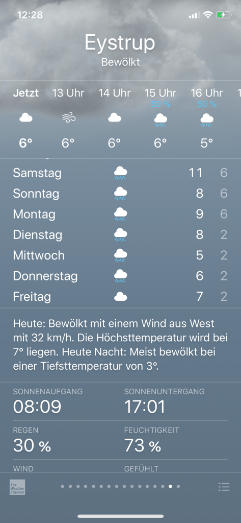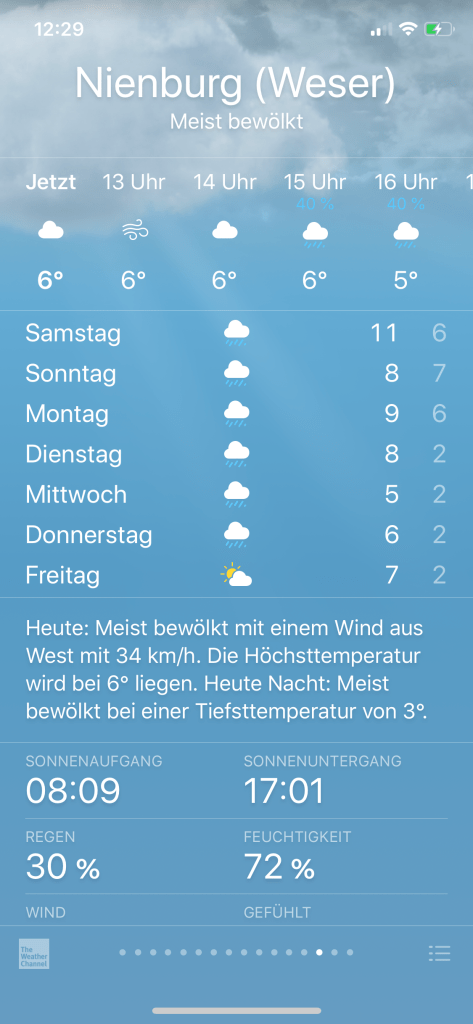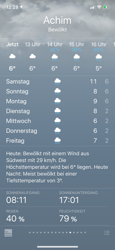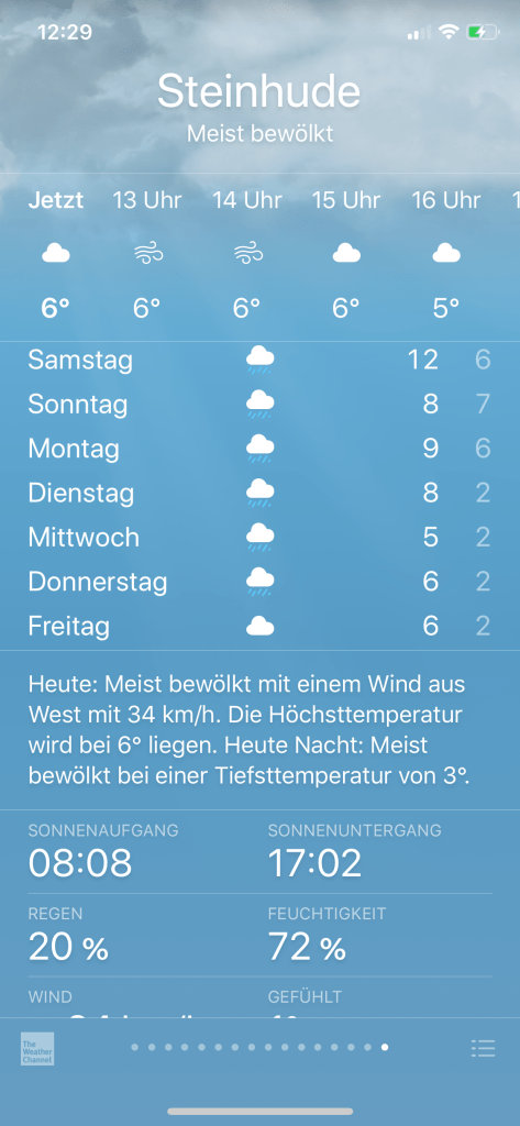 Aufmerksame Leser lassen sich nicht täuschen. Der blaue Hintergrund ist die DERZEITIGE Wetterlage, nicht die Vorhersage. Dennoch lässt sich Licht am Horizont gen Steinhude erahnen. Und es gibt ja auch Klugscheißer, die meinen, es gäbe kein schlechtes Wetter. Also: Regenzeug an und los!
