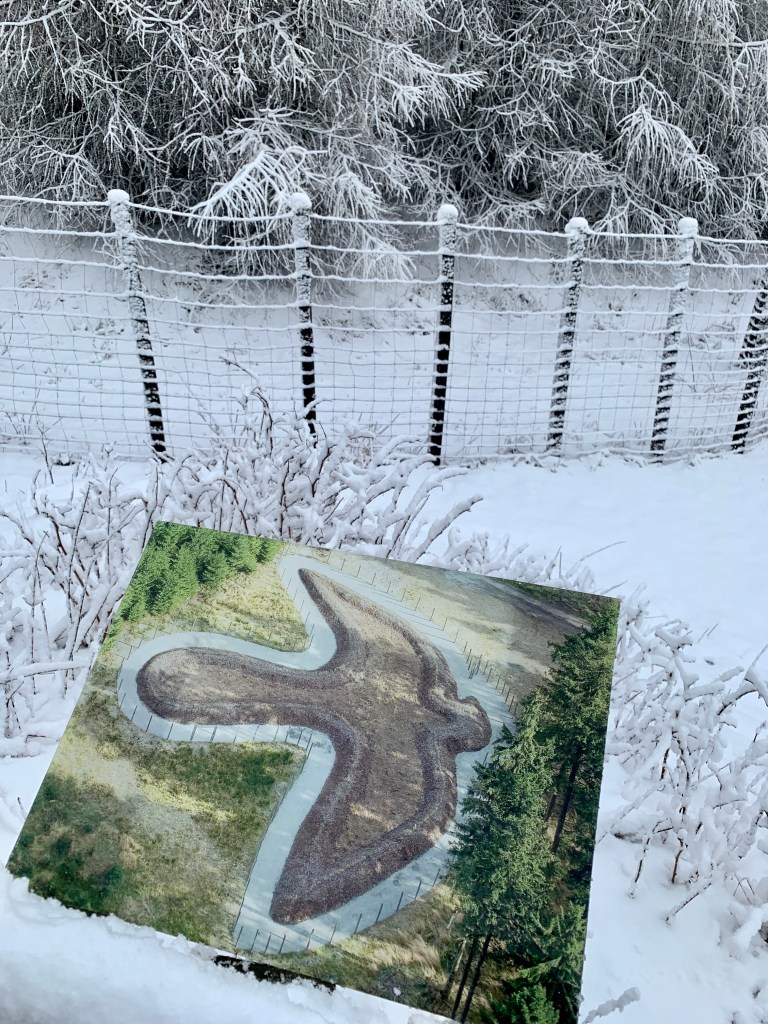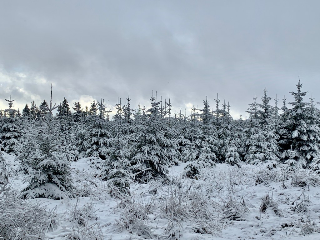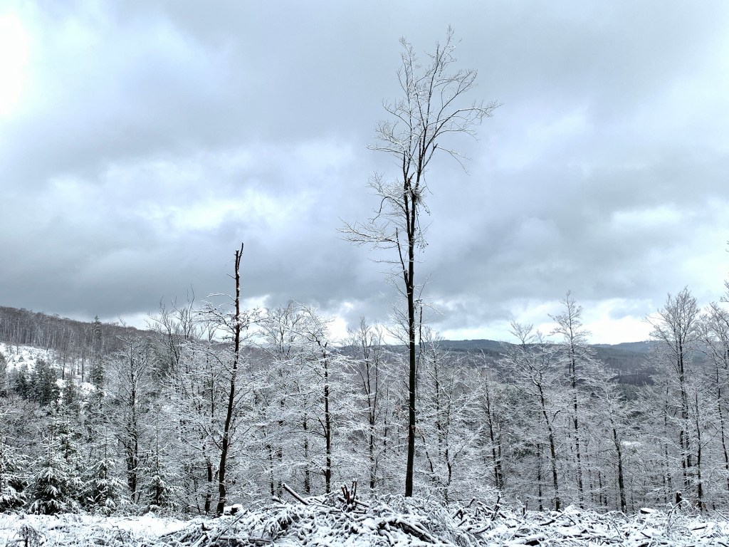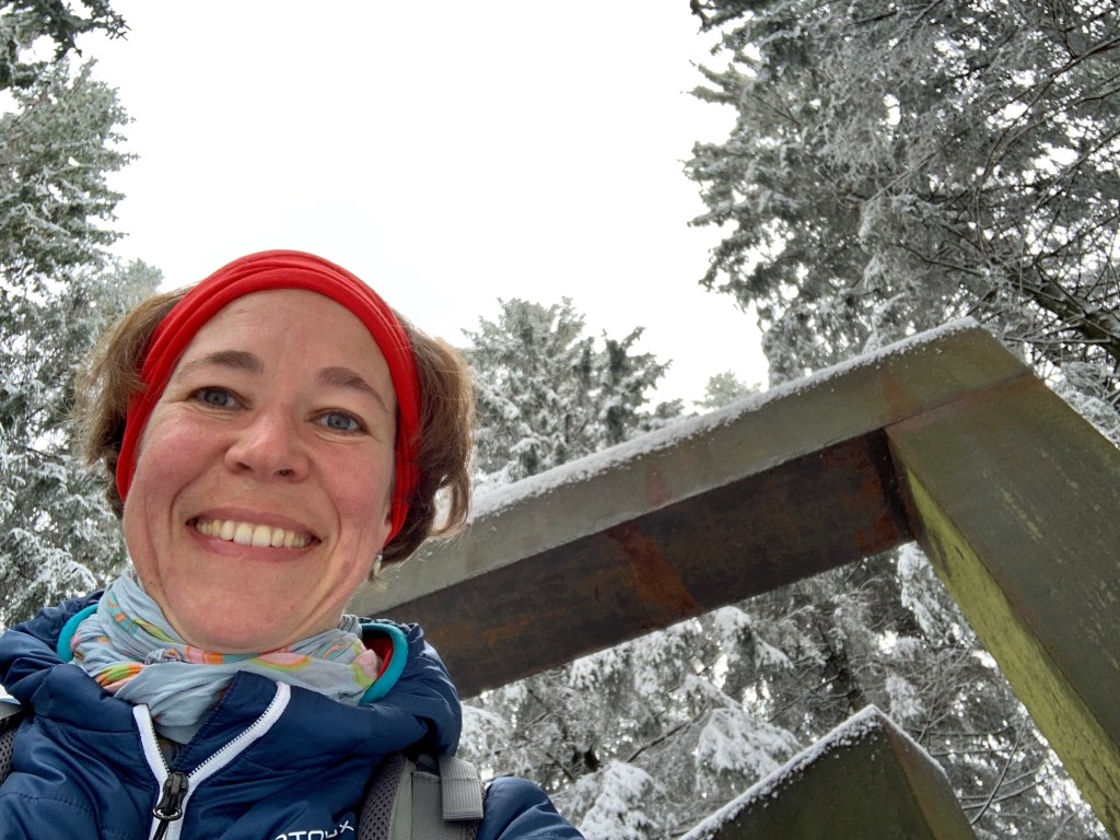 Heute morgen erwachte ich in Winterwonderland – es hatte ein paar Zentimeter geschneit auf 720 Meter Höhe und Schanze erstrahlte in einem Reigen aus Weiß- und Grautönen. Und so geriet die kurze Etappe (13 Kilometer) bis Bad Berleburg zu einem wunderschönen Winterspaziergang.