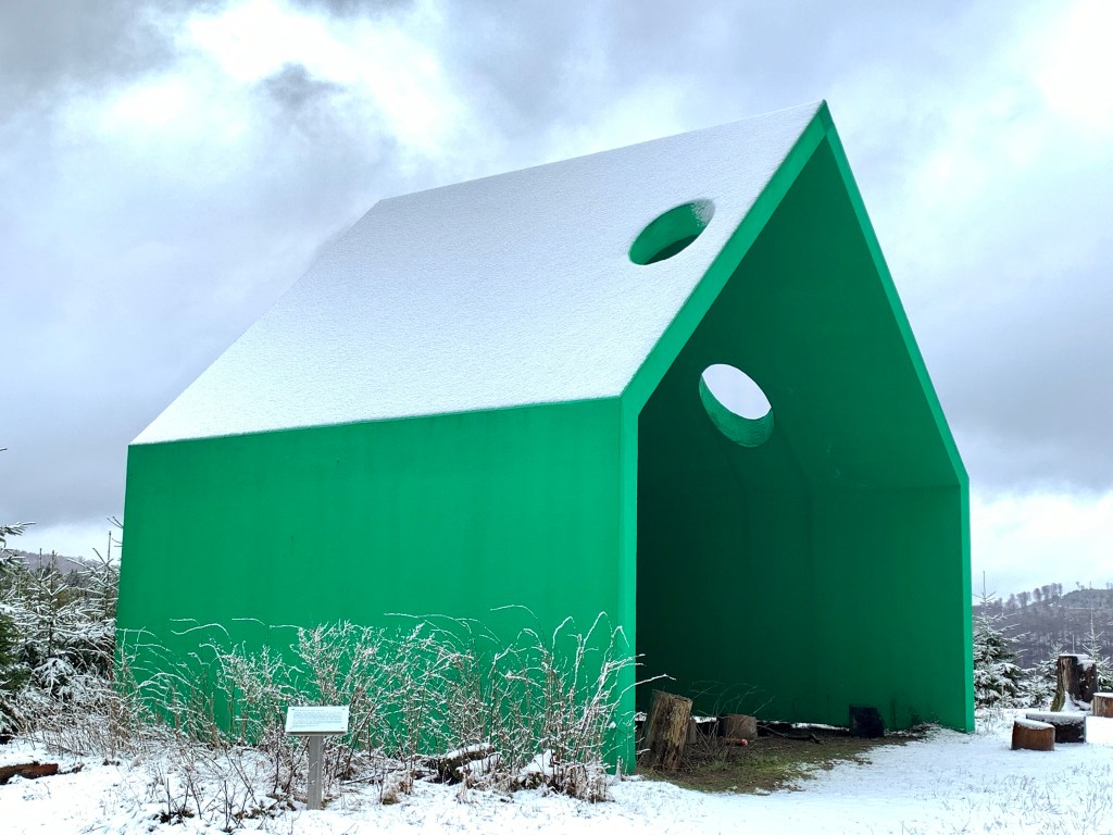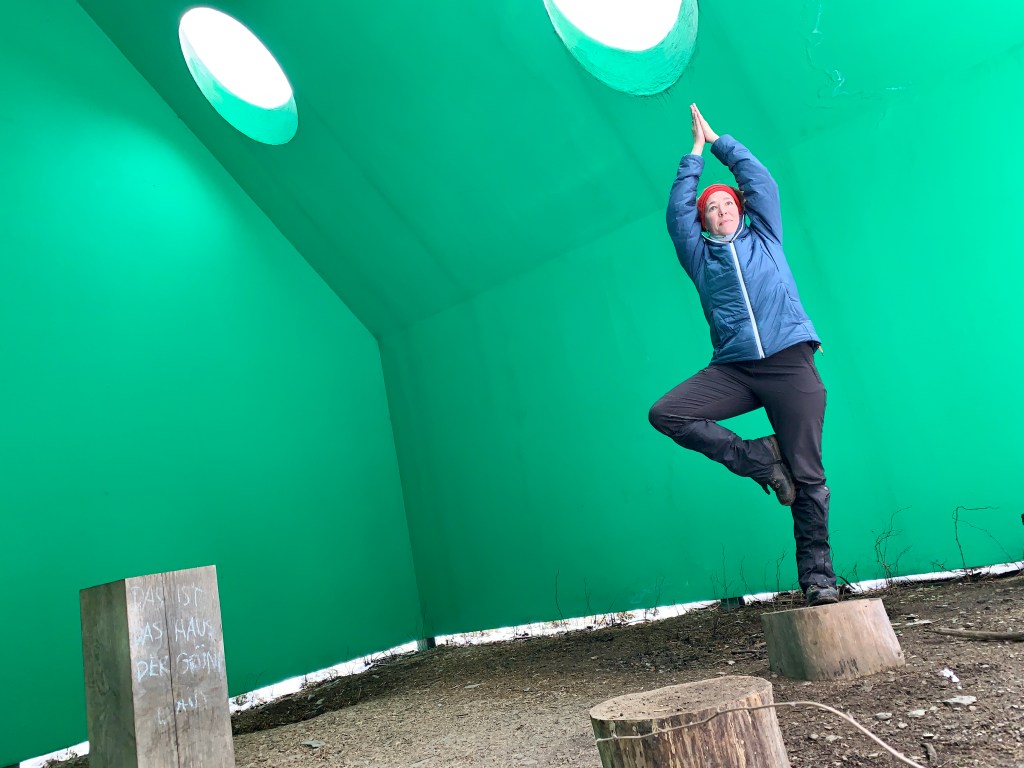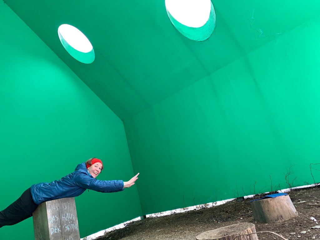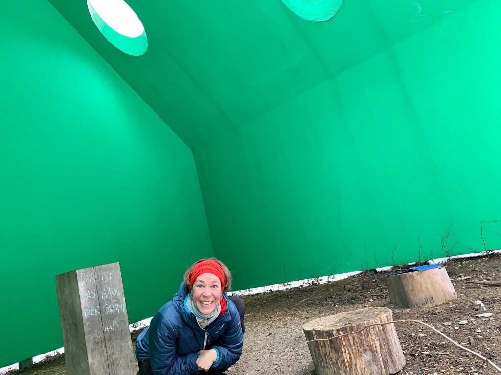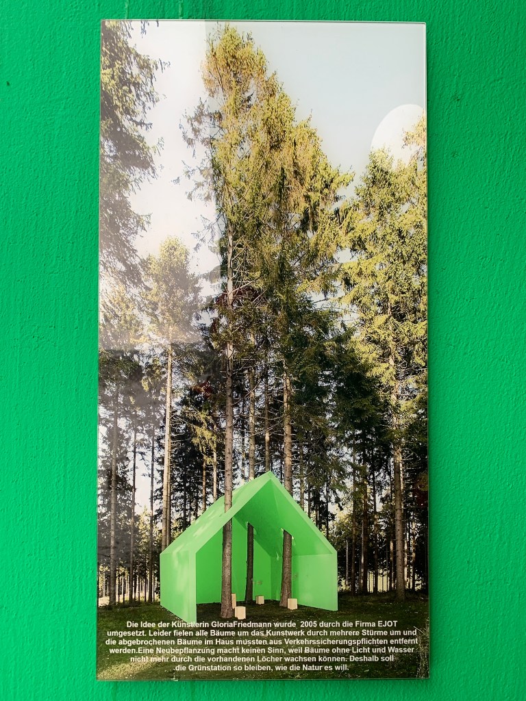 Besonders beeindruckt hat mich die „Grünstation“ der Künstlerin Gloria Friedmann, ein quietschgrünes Haus, das schon von Weitem durch das natürliche Grün der Bäume blitzt und ursprünglich sogar einzelne Bäume integriert hatte … (siehe unten).