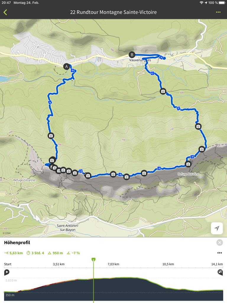 Das heutige Frühstück nahmen wir, wie sich das gehört, unaufgeregt französisch in einem kleinen Café ein und fuhren dann mit dem Bus zum Ausgangspunkt unserer Wanderung. Wir wollten auf den Montagne Sainte-Victoire klettern, den Berg, den Paul Cézanne (ein Sohn der Stadt Aix-en-Provence) unzählige Male gemalt hat. „Nur“ 14 Kilometer, aber ein knackiger Auf- und Abstieg (720 Höhenmeter) und dazwischen eine herrliche Wanderung auf dem Grat.