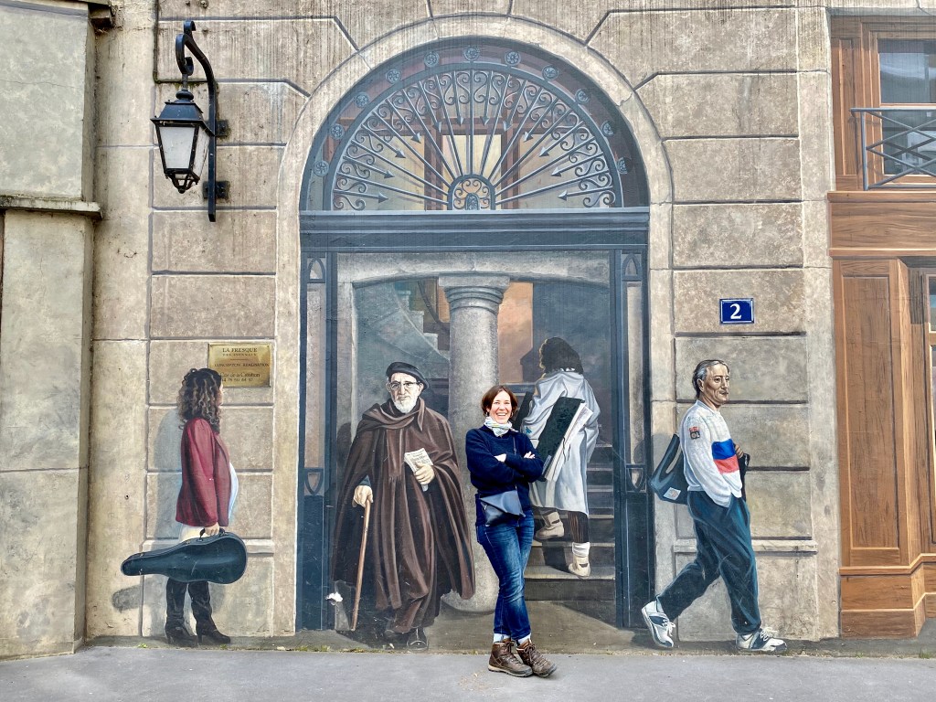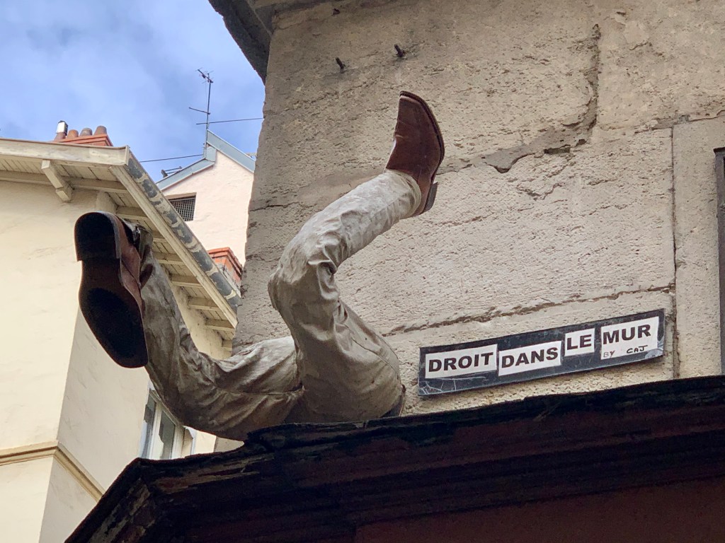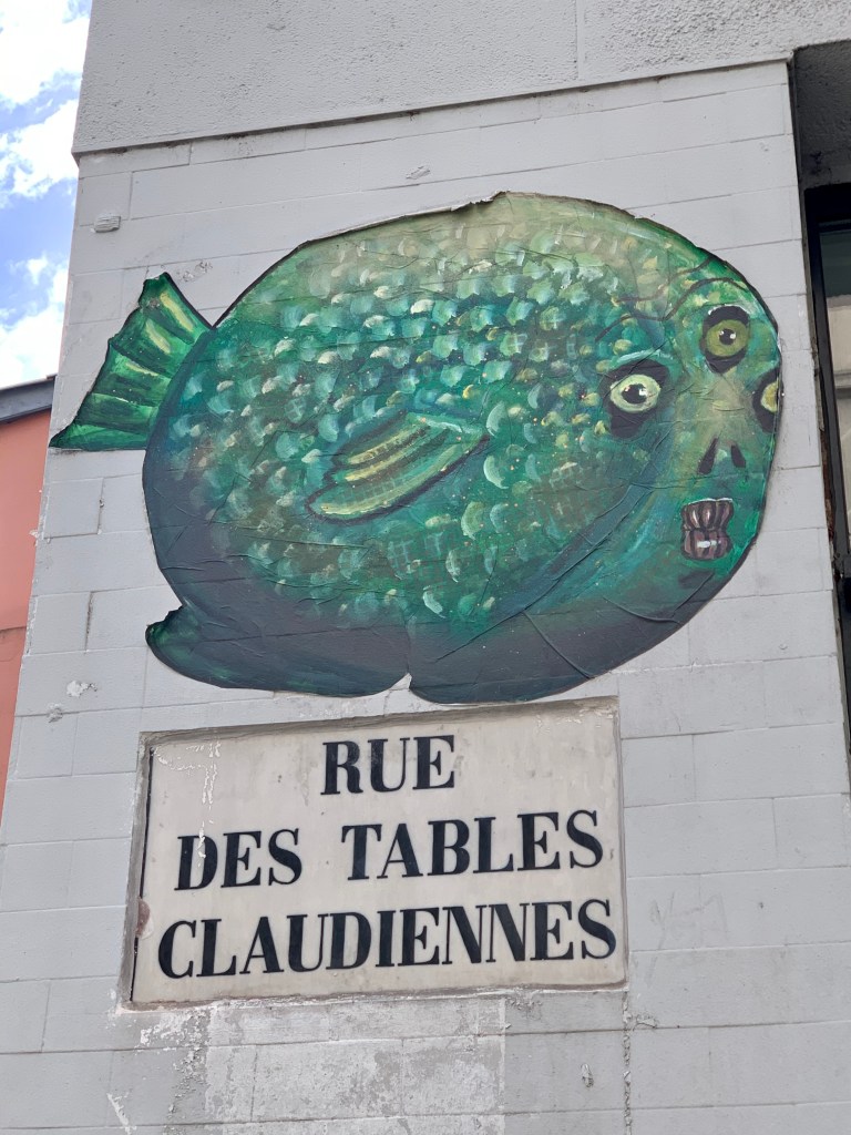 Kontrastiert (fast möchte man sagen: konterkariert) wird die Pracht im Stadtteil Croix-Rousse, dem Lyoner „Viertel“ mit einer recht wilden und für BREMER „Viertel“-Menschlein sehr sympathischen Mischung aus trotzigem Understatement und Guerilla-Kunst, die zum Schmunzeln und Fotografieren einlädt. Dort wanderten wir durch die Straßen und Gassen, treppauf, treppab, ein Blick gen Osten auf das Mont Blanc-Massiv (welche Stadt kann DAS schon von sich sagen?), ein Blick gen Süden auf den Basiliken-Berg, dann über den Markt mit dem typisch-französischen gouter-et-acheter-Angebot (?) und …