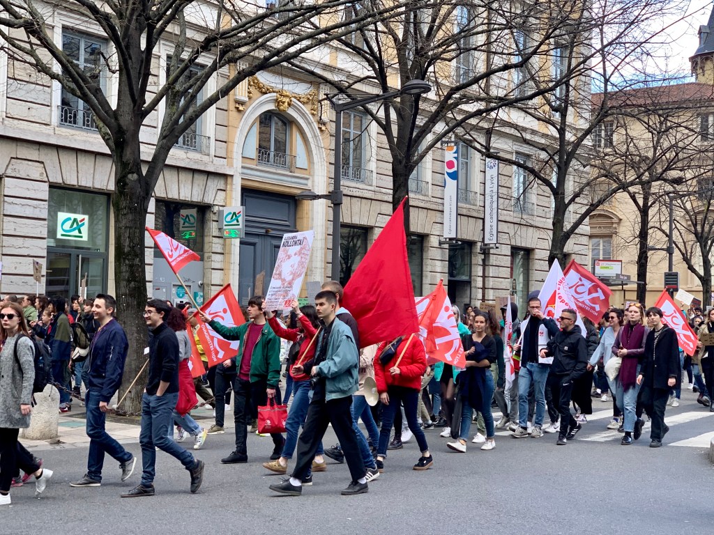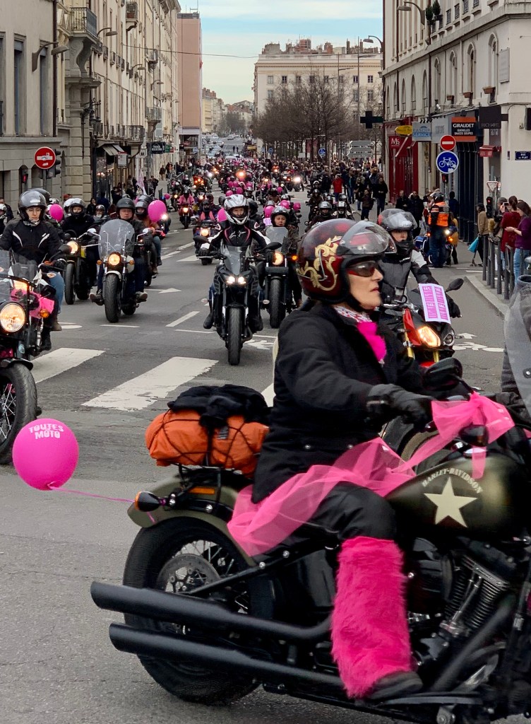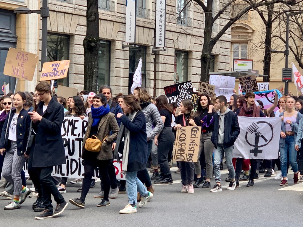 Der 08. März ist weltweiter Frauentag, und augenscheinlich hat das in Frankreich (oder auch nur in Lyon?) sehr viel mehr Relevanz als in deutschen Landen. Als wir vom Berg herunterkamen gerieten wir in die dazugehörige Demo, wobei nicht ganz klar wurde, wer da eigentlich wofür oder wogegen demonstrierte. Auch ohne Französischkenntnisse war die Vielfältigkeit der Banner, Pappschilder und Fahnen erkennbar … Ich denke, die Damen (und auch Herren) hatten sich dennoch grundsätzlich darauf geeinigt, dass sie Frauen ganz gut finden, egal ob sie das barbusig (ohne Foto), motorisiert aufm Bike, mit kämpferischen Kommunistenfahnen oder einfach nur sonntagsspazierend zum Ausdruck brachten. (Ich glaube, der Bruder war ein bisschen verschreckt…).