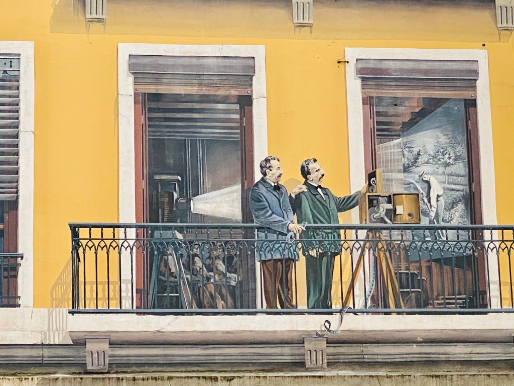 … landeten an einer Stätte mit echtem Touri-Highlight-Potenzial, den Fresque des Lyonnais. Eine sieben Stockwerk hohe Hausfassade, alle Fensteröffnungen vollflächig zubetoniert und übermalt und so zu einem Riesen-Wandbild umgestaltet. Dargestellt sind Töchter und Söhne der Stadt mit mehr oder weniger historischer Relevanz und Prestige-Tracht. Dort trafen wir auch die üblichen Lyoner Verdächtigen wieder: Antoine und sein kleiner Prinz, der Kasper Guignol, die Brüder Lumière (die Erfinder des modernen Kinos wurden schändlicherweise noch gar nicht erwähnt) und Paul Bocuse … und wer genau hinsieht, findet noch ein weiteres bekanntes Gesicht! 😉