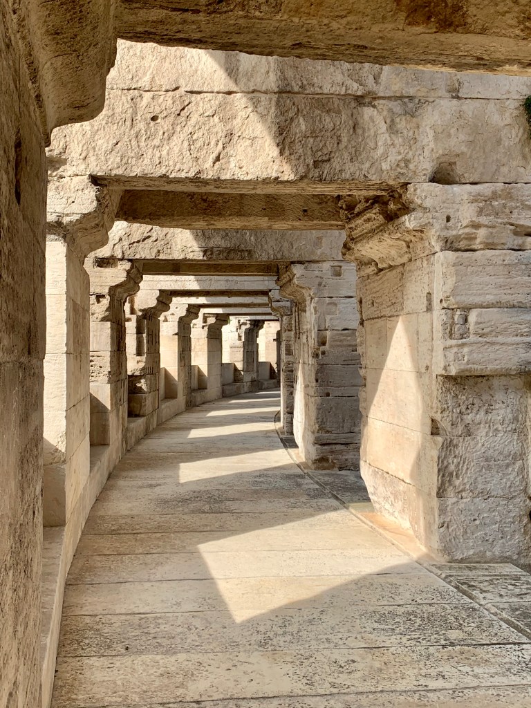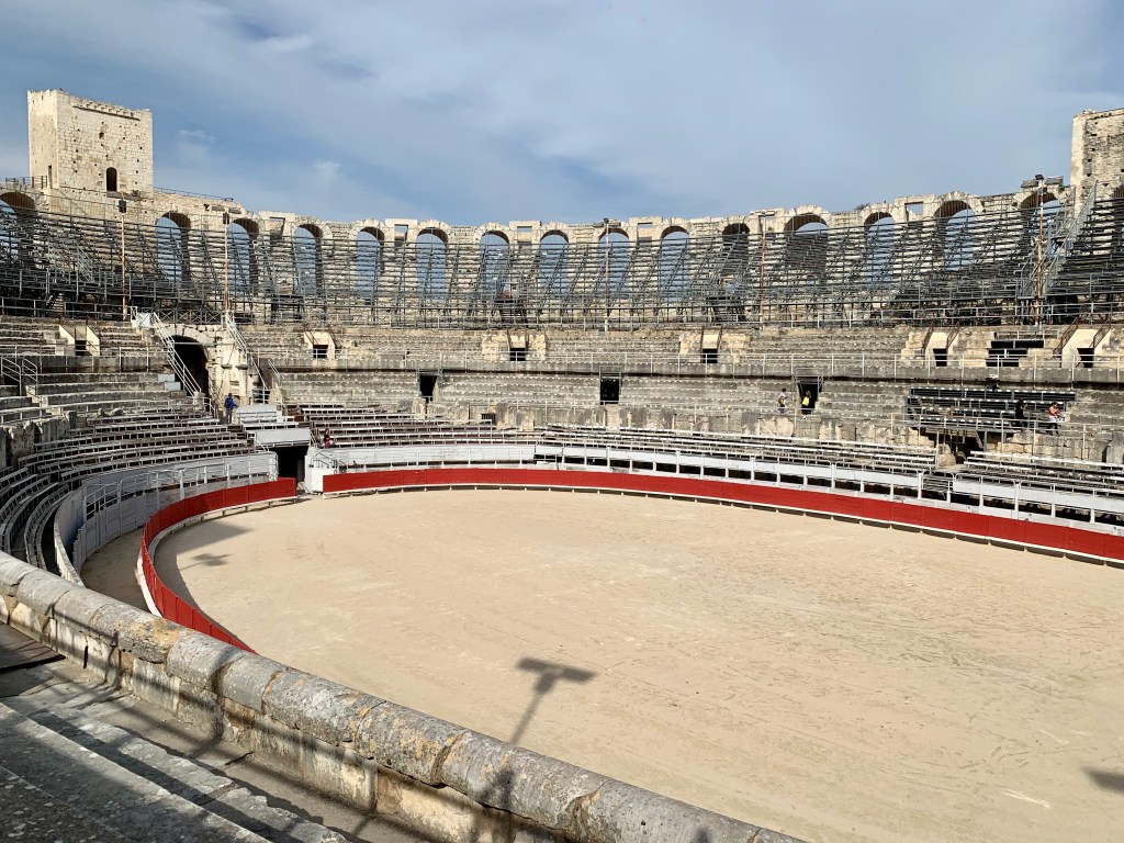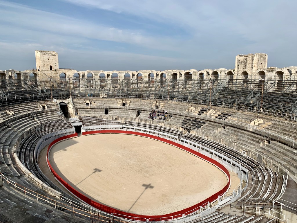 Das Problem, so las ich, sei schon 1840 (als man die Erhaltung des nationalen Baudenkmals beschloss) gewesen, das historische Bauwerk einerseits zu erhalten und es gleichzeitig für aktuelle Großveranstaltungen zu nutzen – damals sowas wie die Feierlichkeiten zur Eroberung Algeriens. Genauso ist es auch heute noch: Die Tribünenkonstruktion, die sich in luftige Höhen aufschwingt (nichts für Höhenängstliche!), versperrt die Sicht auf die hübschen historischen Steinbögen fast komplett. Da ist es doch tröstlich zu wissen, dass wenigstens richtigrichtig viele Zuschauer die in Südfrankreich erlaubten Stierkämpfe sehen können (Hände vors Gesicht schlagendes gelb-blaues Emoji)! Mon dieu! Die spinnen, die Franzosen, beim Teutates!