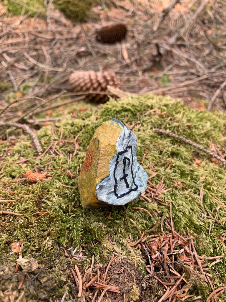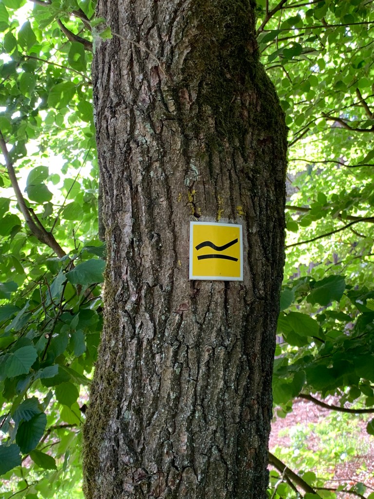 Gleich zu Beginn fand Schweinehund – der sich bis auf ein Anfangsjaulen (warum muss ICH jetzt laufen, wo doch die anderen eh die gleiche Strecke mit dem Auto und das ist doch total bescheuert…) sehr kooperativ zeigte – ein hübsch bemaltes Steinchen am Wegesrand, das wir als gutes Omen deklarierten und in die Rucksacktasche steckten. Und am Ende traf ich einen alten Bekannten wieder: den Rothaarsteig, der schon im Februar auf mehreren Etappen meinen Weg gekreuzt hatte.