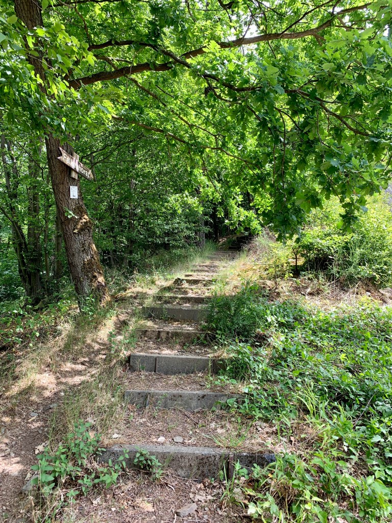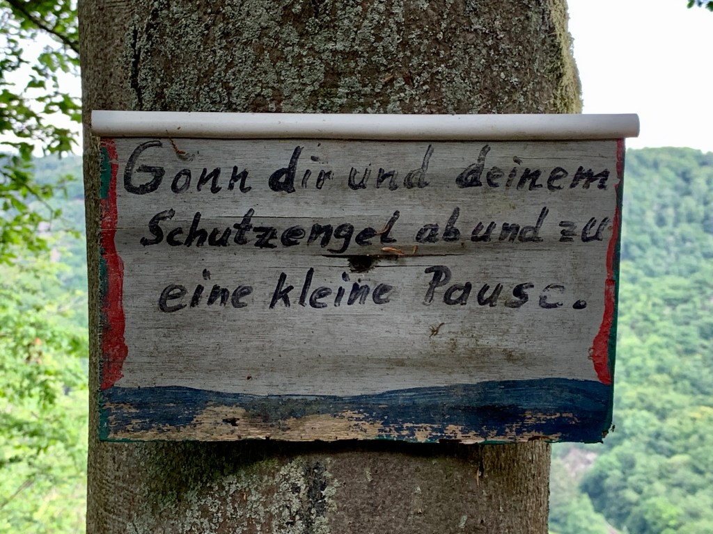 Nach einem Mittagspäuschen im Klosterhof ging es bei mittlerweile bedecktem Himmel weiter. Und weiter hieß: Steil bergauf und steil bergab und steil bergauf undsoweiterundsofort, der Weg war mittlerweile ein Pfad und führte vorbei an hübschen Ausblicken auf den Fluss, der da tief unten in seinem Bett lungerte. Und bei jedem Ausblick gönnten wir uns und unseren Schutzengeln (siehe Foto) eine kleine Pause, um die Köpfe und andere Wunden zu lecken.