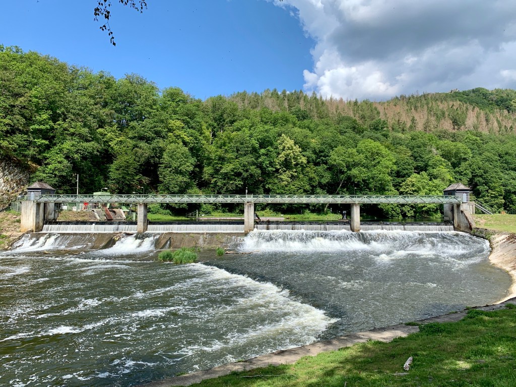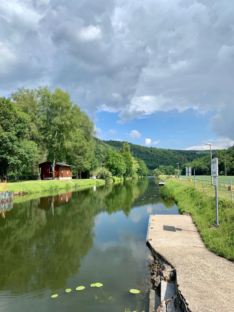 Kurze Zeit später traf ich den Laster bzw. seinen Fahrer wieder, der mir wild gestikulierend entgegen hüpfte. Er wolle mir noch ein paar Geheimtipps für die Umgebung geben. „Das ist ja so schön, dass Sie hier wandern!“ Und: „Ist das nicht bescheuert schön hier?“ Und dann empfahl er mir eine Begehung des nahegelegenen Wehrs bzw. der Schleuse Hollerich und einen Besuch im Kloster Arnstein („Die Mönche dort haben meine Mutter beerdigt, und das haben die ja SO schön gemacht!“), was ich beides pflichtschuldigst erledigte.