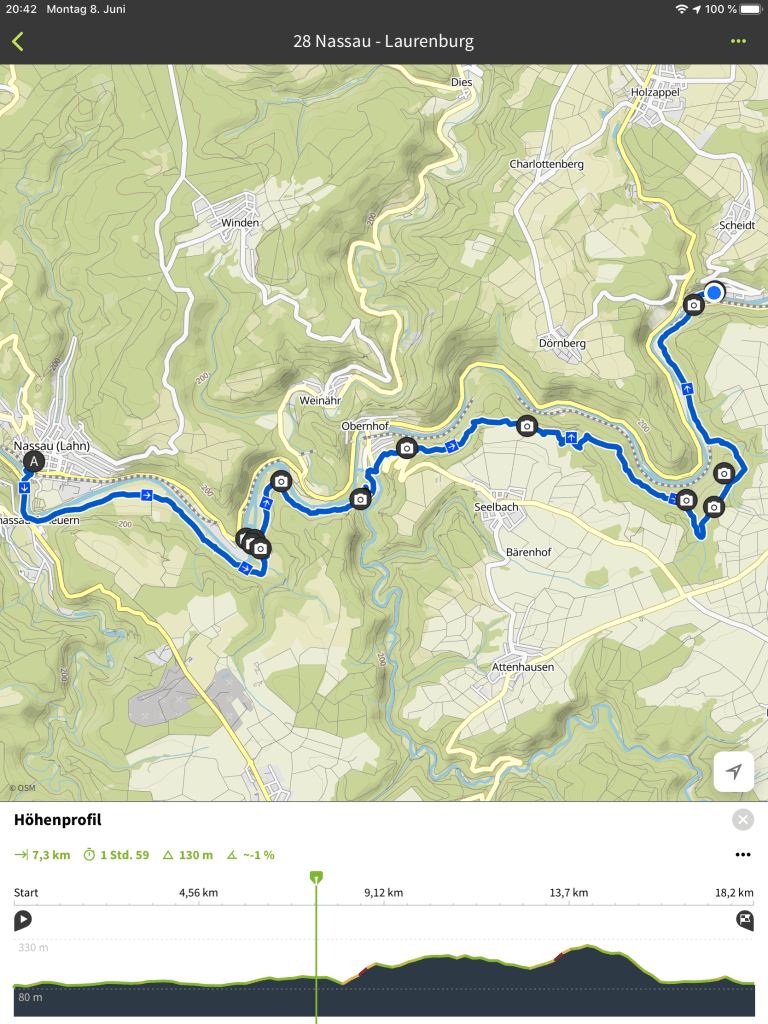 Heute ging es an der Lahn entlang 18 Kilometer nach Laurenburg. Ohne Kopfschmerzen und unleidlichem Schweinehund wäre der Tag deutlich erquicklicher gewesen, und deswegen peile ich heute mal einen kurzen Blog-Eintrag an.