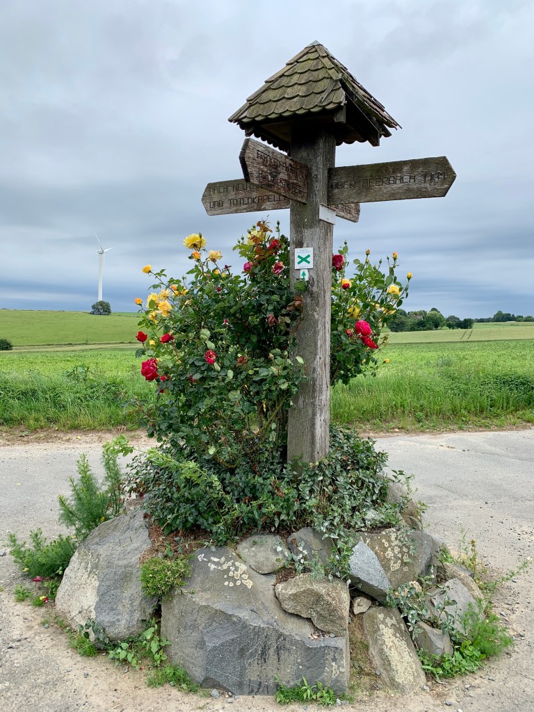 Leider verdunkelten besagte Wolken nicht nur den Himmel, sondern auch die Sicht. Nachdem ich 15 Kilometer ohne Regen hinter mir hatte, waren die Wolken so dick und schwer und dunkel, dass ich losspurtete und die restlichen Kilometer im Sturmschritt zurücklegte, weil ich ein ziemliches Unwetter erwartete. Schweinehund galoppierte kopfschüttelnd neben mir her. Wenn ich gewusst hätte, dass BIS JETZT kein Tropfen Regen fallen würde, hätte ich uns das erspart.
