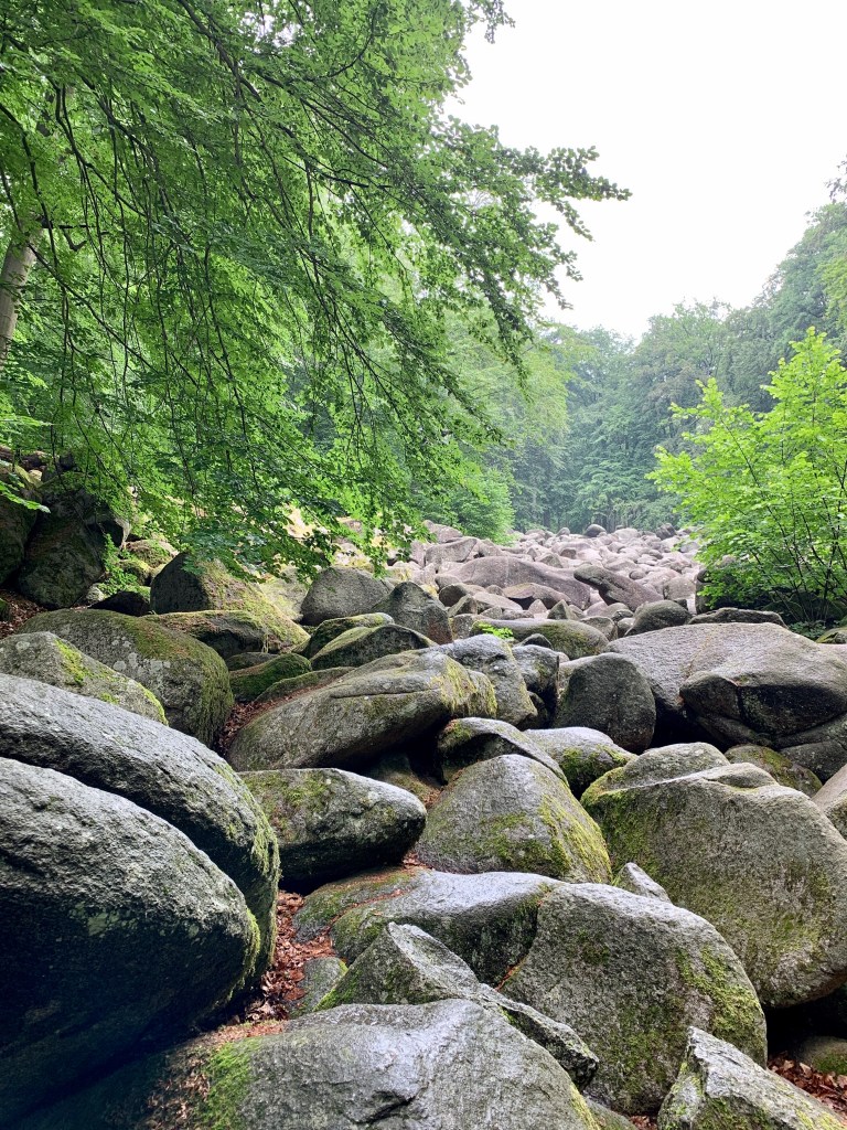 Die Etappe begann mit einem steilen Aufstieg auf den Felsberg und einem ebenso steilen Abstieg durch das Felsenmeer nach Reichenbach. Felsberg und Felsenmeer bieten bei schönem Wetter und am Wochenende allerlei touristische Infrastruktur wie Kioske, Eisbuden und dergleichen – heute war dort nur feucht-neblige Einsamkeit.