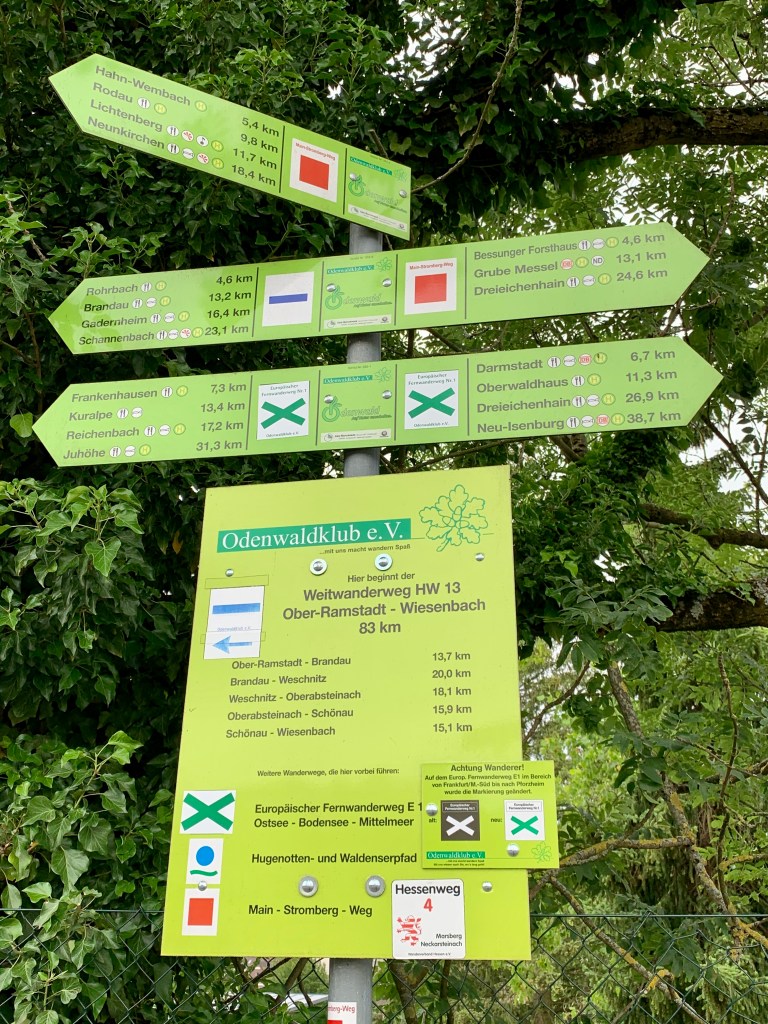 Der Odenwald ist touristisch präpariert, als gäbe es kein Morgen! Dies hat offensichtlich der Odenwaldklub e.V. zu verantworten, dessen Vorsitzender wiederum hauptberuflich Schildermacher zu sein scheint, denn an jeder Kreuzung steht eine Armada von quietschgrünen Wegzeigern. Penetrant springen sie der Wandersfrau in die Augen und weisen penibel die Wege – und was für Wege sich hier tummeln! Der Alemannenweg, der Nibelungensteig, der Weitwanderweg HW13, der Main-Stromberg-Weg undundund … mein kleiner süßer E1. Damit Frau Komoot nicht denkt, ich brauche sie nicht mehr und grummelig wird, gehe ich ab und zu absichtlich falsch, damit sie mich mit einem bestimmten: „Du bist nicht mehr auf der Route. Bitte sieh in die Karte!“ wieder auf den rechten Weg bringen kann.