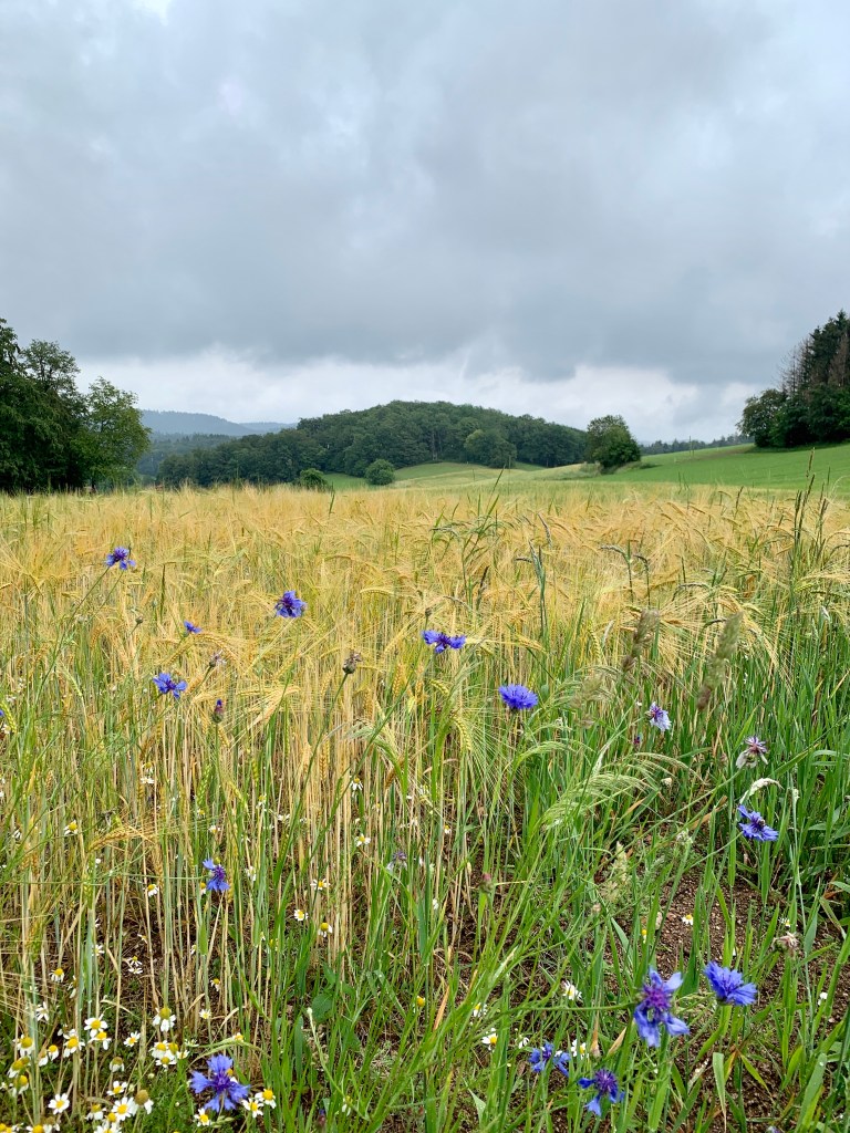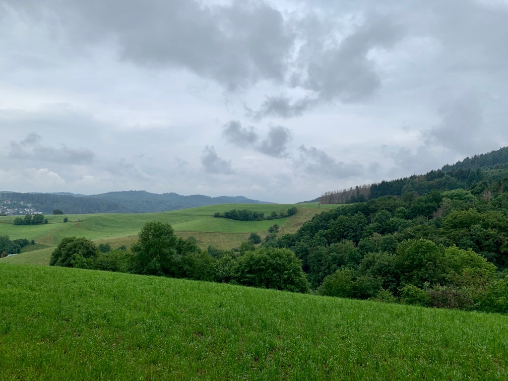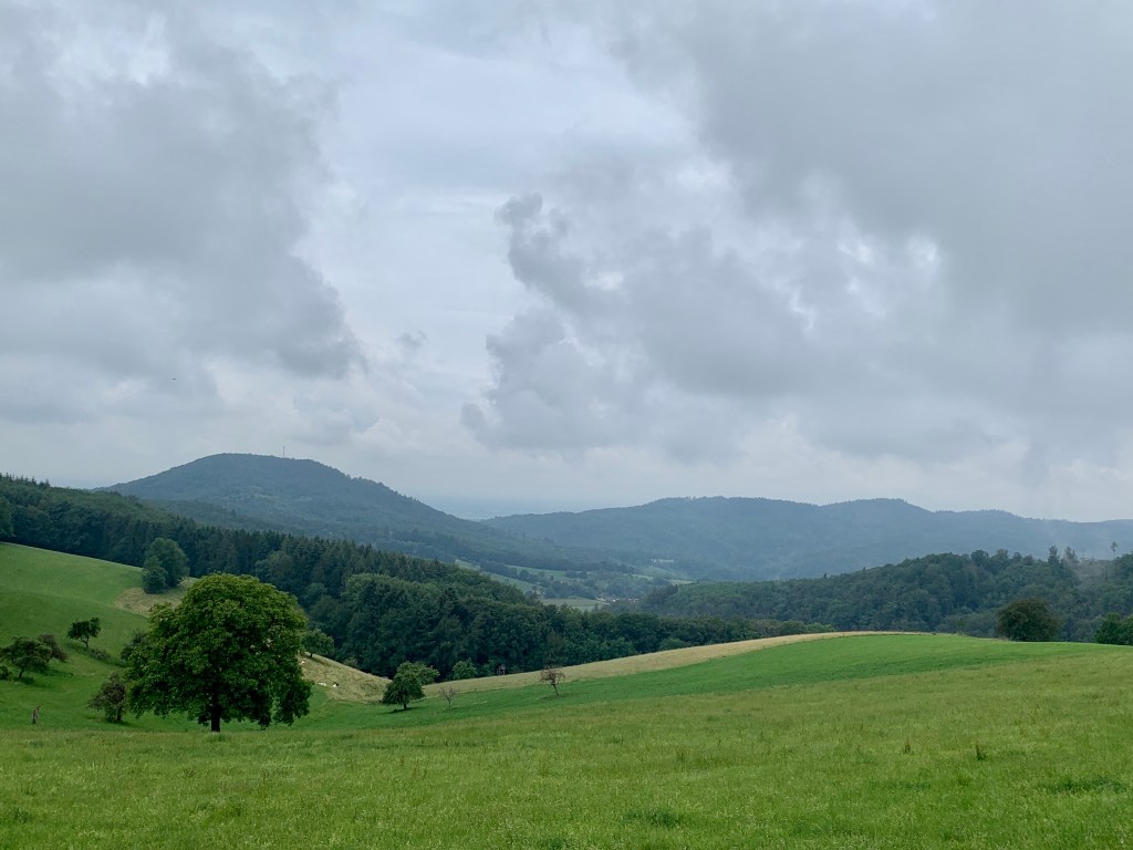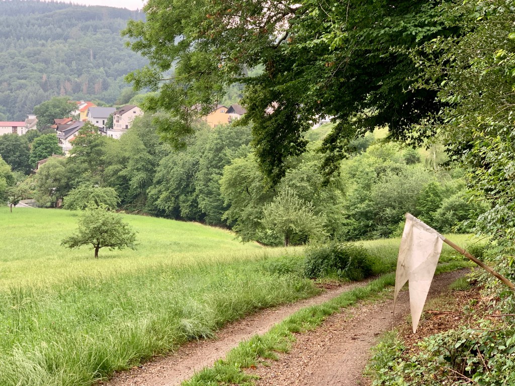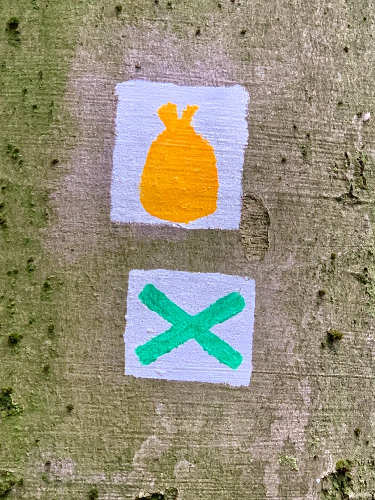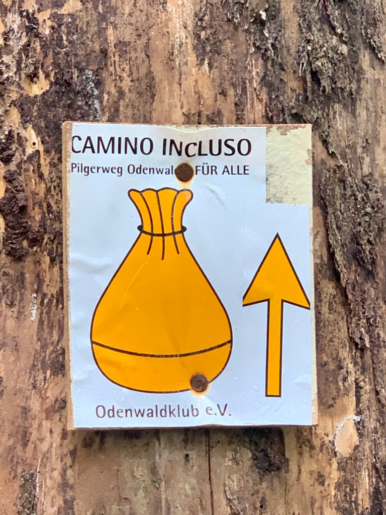 Die längste Zeit heute dachte ich, ich würde neben dem E1 (grünes Kreuz) auch dem „Pfad der gelben Ananas“ folgen – Schweinehund sah sich schon am Südsee-Strand mit einem Pina Colada in der Pfote – aber nein. Relativ am Schluss klärte sich die Sache auf. Die Ananas war ein Sack (Pilgerbeutel, wie ich gerade gegoogelt habe) und ich wandelte auf dem Camino Incluso, dem Odenwälder Pilgerpfad für ALLE (der just im Frühjahr 2020 eingeweiht wurde). Wie ALLE – also wirklich ALLE – aber auf diesen Wegen wandeln sollen ist mir, ehrlich gesagt, ein Rätsel. Nun gut, ich sag‘s auch nicht dem Odenwälder Inklusionsbeauftragten.