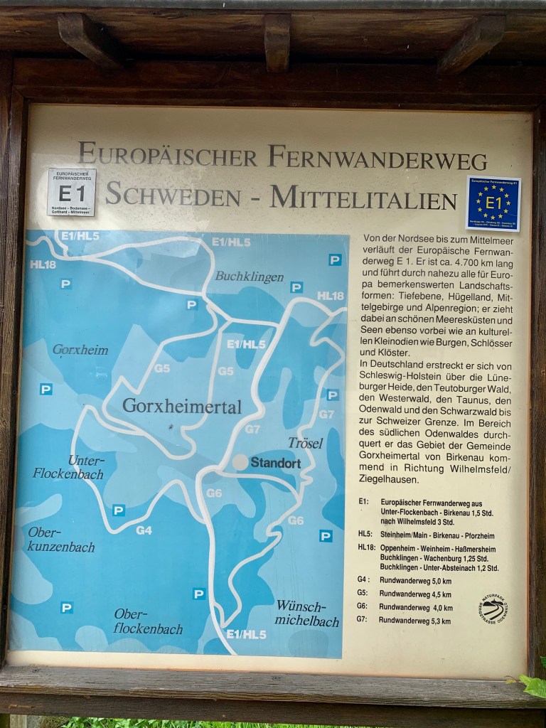 Auf jeden Fall ist den Unter-Flockenbachern der E1 eine Infotafel wert, die mitten im Ort Aufschluss über dessen Verlauf in der näheren Umgebung gibt. Dass der E1 an der Ost- und nicht an der Nordsee verläuft (weil von Schweden über Dänemark kommend), ist dabei wahrscheinlich ein Detail, das hier im Badischen nur eine marginale Rolle spielt. Kein E1-Wanderer hat je die Nordsee gesehen – es sei denn, es gibt eine Weg-Variante, die ich nicht kenne.