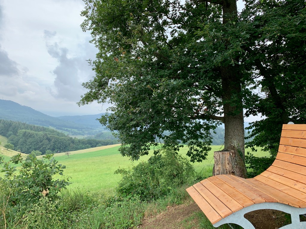 Nach diesem verstörenden Moment ging es bei Nieselregen hinaus aus Birkenau und – mal wieder – hinein in den Wald und den Berg hoch. Da es trotz Regen ziemlich warm ist und ich im Wald ja auch einigermaßen geschützt bin, laufe ich – wenn es nicht gerade ganz schlimm schüttet – ohne Regenjacke. Nach so einer Berg-hoch-Stapferei bin ich dann innerlich und äußerlich klatschnass, so dass das Rothaarsteig-Bänkchen mit Blick auf die wolkenverhangenen Odenwaldberge gerade recht kam.