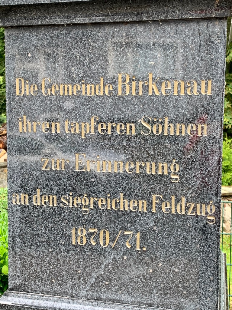 In Birkenau touchierte ich nochmals kurz eine dieser merkwürdigen Gedenkstätten. Diesmal wurde den „tapferen Söhnen“ und dem „siegreichen Feldzug“ von 1870/71 gedacht. Das ist jetzt … äh … 150 Jahre her. Da fragt man sich doch ernsthaft und immer wieder, ob DAS eigentlich noch zeitgemäß ist. Ich fand das wieder mal ziemlich verstörend, verkörpert so ein Mahnmal doch all das, was wir eigentlich zu überwinden im Begriff sind (oder vor Trump zumindest waren): Nationalismus, Militarismus, martialisch-hierarchisches Denken und Tun, Imperialismus.
