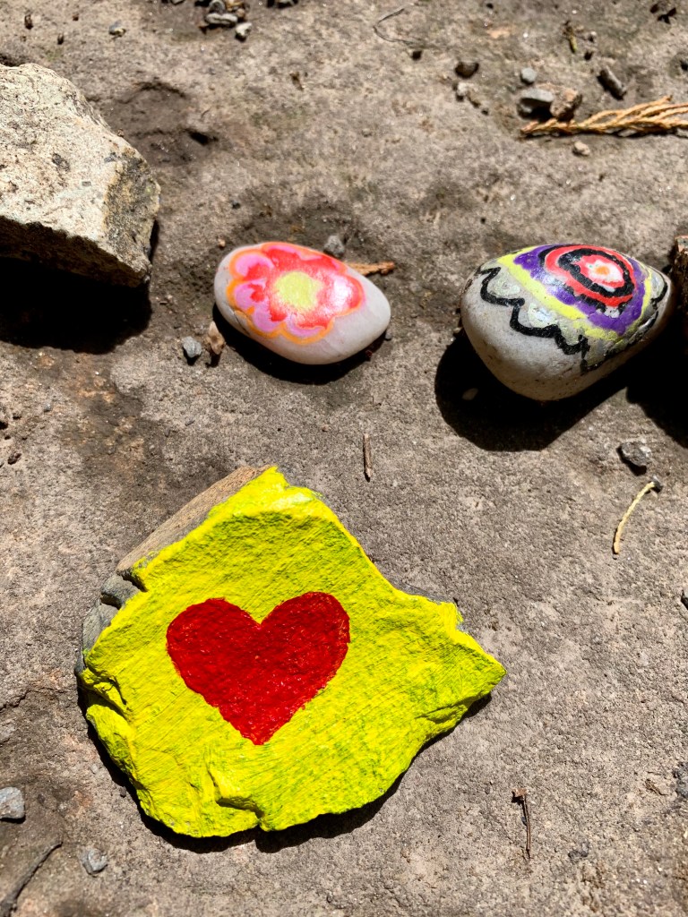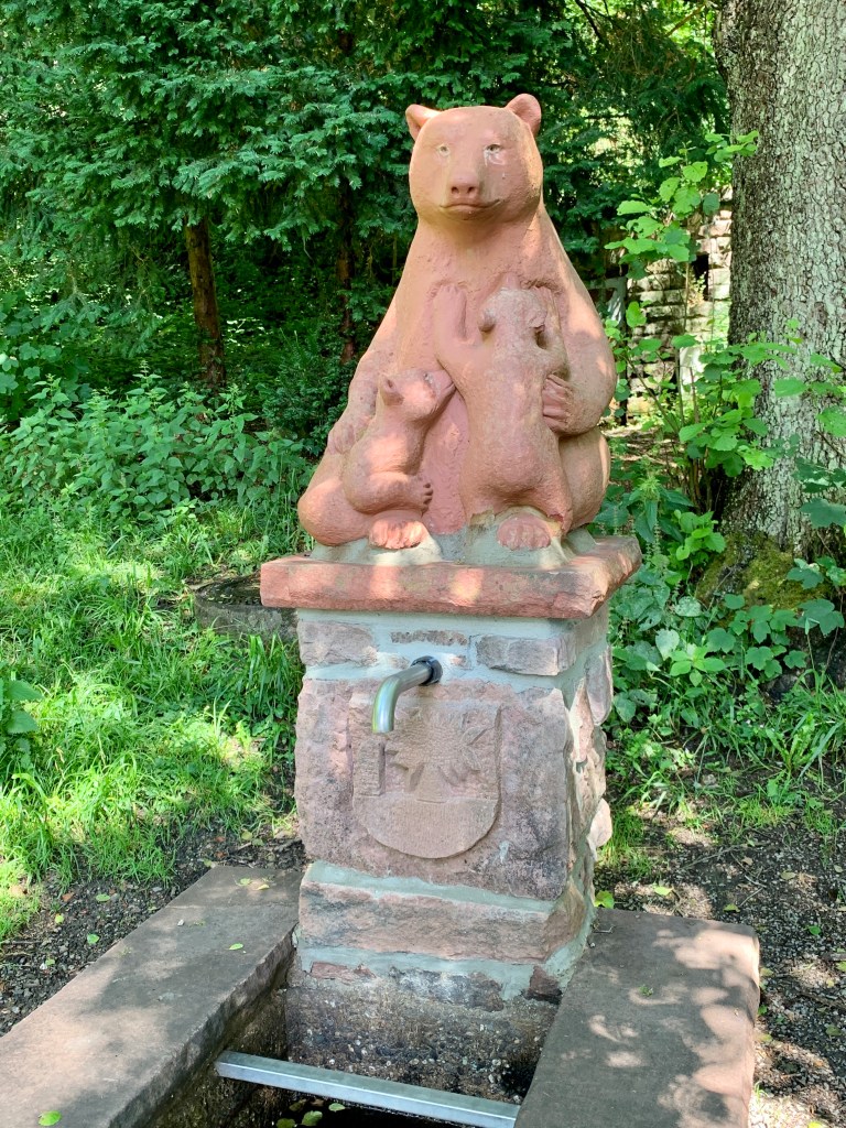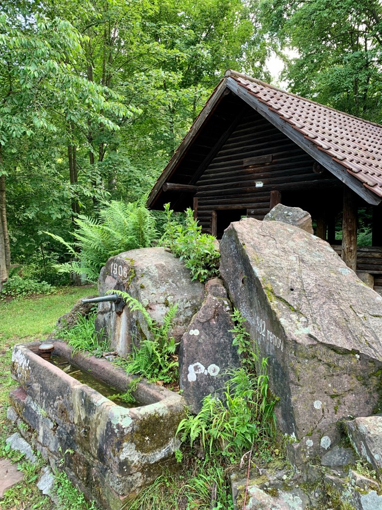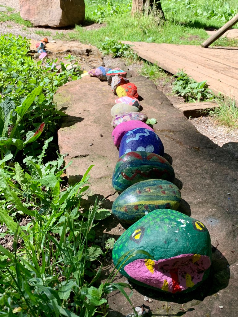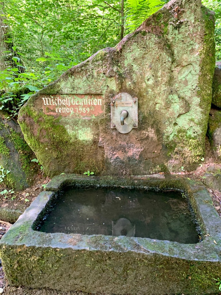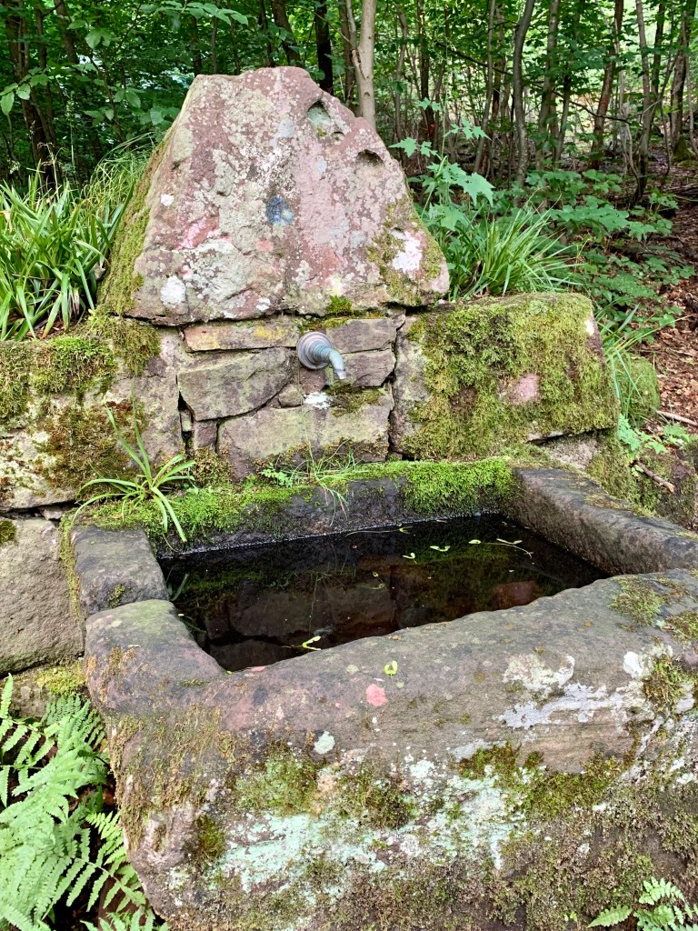 Erfreulicher ging es weiter. Durch den Wald, oft auf schmalen Pfaden und immer wieder lag ein hübsches Brünnlein am Wegesrand und sonnte sich. Am Bärenbrunnen lag da außerdem eine Schlange. Schweinehund quietschte vor Vergnügen: Eine ganze Schlange aus bemalten Steinen! Er suchte sich den schönsten vom Schlangenende (leicht musste er ja sein!) aus und wir tauschten ihn gegen unseren Quietsch-Herz-Stein. Langsam fängt das an, Spaß zu machen! (Bei der Gelegenheit: Herzlichen Dank an die Spenderin des digitalen Steinchens – Silkezwo – wir haben uns sehr gefreut.)