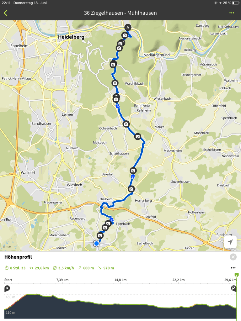 Als ich Ziegelhausen bei herr-lich-stem Wanderwetter über die Neckarbrücke verließ, schaufelten oder pumpten die Menschen gerade reihenweise Wasser aus ihren Kellern. Das WAREN aber auch Regenmassen gestern! (Rückblickend bin ich doch sehr froh, dass ich da nicht im Wald unterwegs war.)