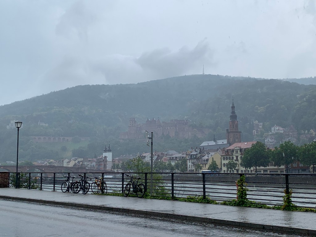 Kaum kam ich gegen Mittag mit dem Bus in der Stadt, ging ein fürchterliches Gewitter über Altstadt und Schloss hernieder, das mindestens Gedanken an Sintflut und Weltuntergang heraufbeschwor und mich erst in eine Tiefgarage und – als es dann mal kurz etwas besser wurde – in die nächstbeste Kneipe flüchten ließ. Damit hatte ich schon mal zwei nasse Füße.