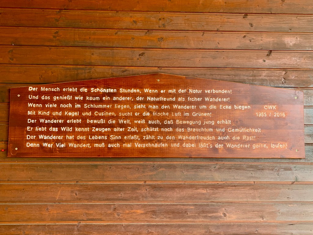 2. Die Odenwaldklub-Hütte Kraichtal war geschlossen. An der Außenwand der Hütte jedoch hing ein Stück Lyrik der feinsten Sorte. Ganz offensichtlich wurde die Original-Ode an den Wanderer aus dem Jahr 1985 vor vier Jahren überarbeitet. Nur: Welche Aspekte wurde da überarbeitet? Sprachlich-orthografische jedenfalls nicht … vom Versmaß ganz zu schweigen!