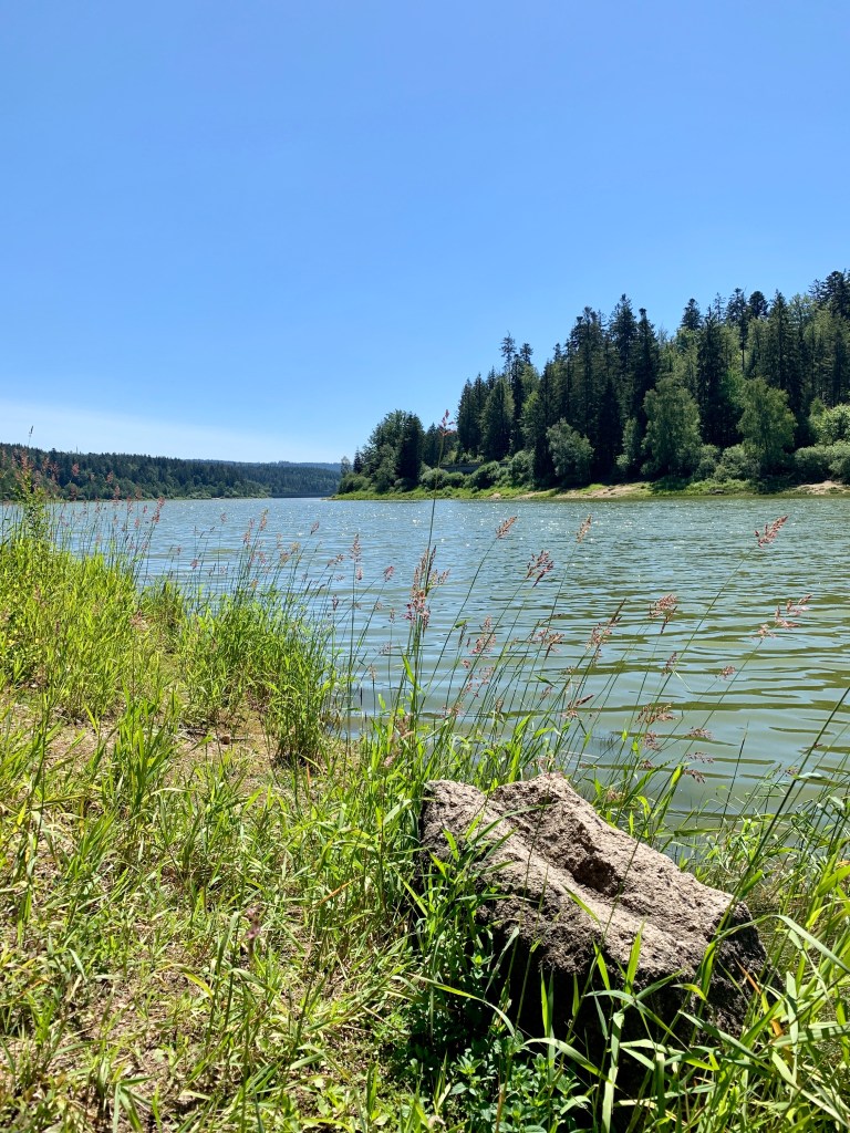Nach den ersten 500 Höhenmetern lag da die Schwarzenbach-Talsperre und lud zum Bade. Scheinehund war selbstredend der erste, der mit einem Bauchpflatscher im kühlen Nass landete, Silke hinterher in die Fluten und Frau Komoot blieb vornehm am Gestade zurück und hütete unsere Habseligkeiten.