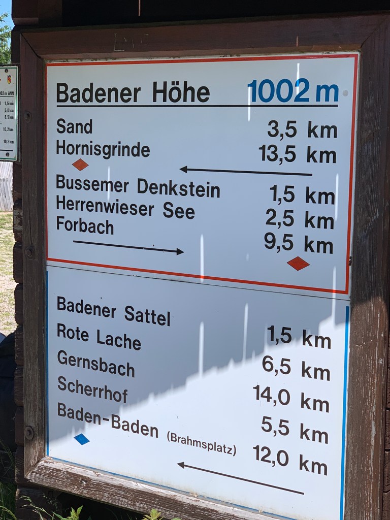 Bei der Phillipp-Bussemer-Gedenk-Tafel (endlich oben auf der s.g. Badener Höhe) traf ich zwei Baden-Badenerinnen beim stillen Gedenken und gesellte mich dazu. Wir hatten dann ziemlich schnell aus-gedenkt und tauschten uns darüber aus, wie GROß-AR-TIG doch das Wandern sei und wie tolltolltoll der Schwarze Wald. Im Überschwang ließ ich mich zu einem Touristen-Foto überreden – wer nun aber der gute Herr Bussemer wirklich war, vor dessen Gedenktafel ich posierte, ist nicht wirklich klar. Hier stehen ständig und relativ lückenlos irgendwelche zum Gedenken an verdiente Mitglieder des Schwarzwaldvereines anregende Tafeln, Steine, Hüttchen etc. herum, da verliert man leicht den Überblick.