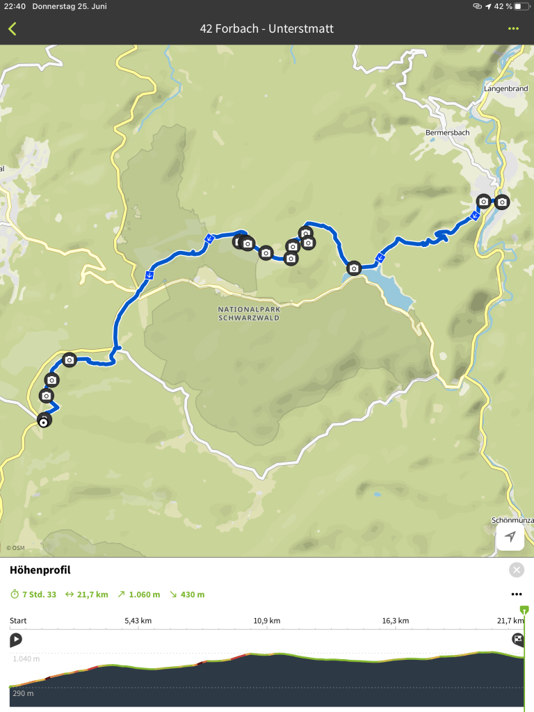 Der gestrige Tag also begann in Forbach und endete 22 Kilometer später auf eben diesen 1.000 Metern Höhe an einem Ort namens Unterstmatt. (Warum nun gerade DIESER Ort UNTERSTmatt heißt, erschließt sich mir nicht, liegt er doch eben relativ hoch oben, auf den Schwarzwaldhöhen, der Gute).