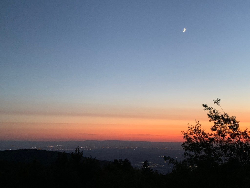 Abschließend erfreute ein kleines Hochmoor mein Herz, bevor ich in Unterstmatt einlief und auf die Wanderfamilie traf. Das Abendessen genossen wir auf der Terrasse der Unterkunft mit Blick auf Sonnenuntergang, Vogesen, Straßburg und den aufgehenden Sichelmond. Was kann es Schöneres geben?