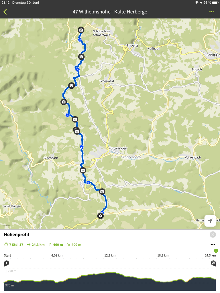 Das Wetter war ungewöhnlicherdings feucht-kühl, so dass wir mit Regenschutz losliefen Richtung Gasthof „Kalte Herberge“ (24 Kilometer). Von dort ging es dann heute nach Hinterzarten (21 Kilometer – mit Abkürzung).