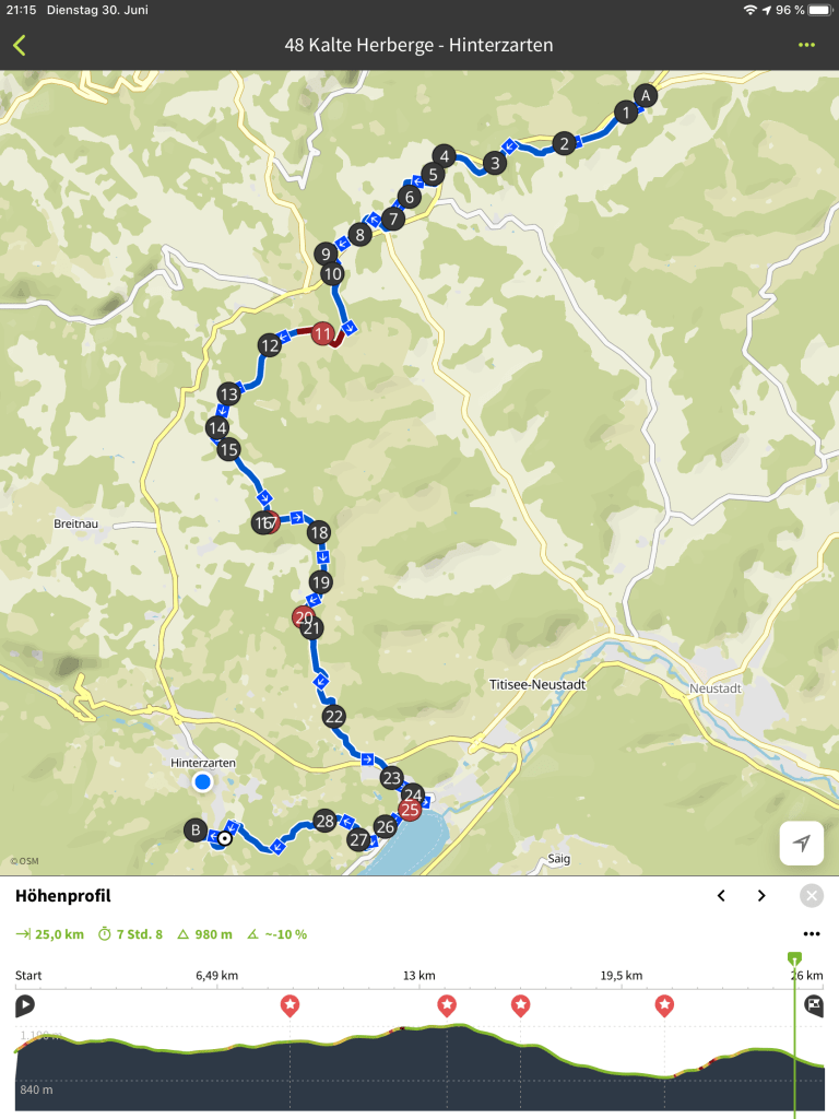 Da ich den größten Teil der heutigen Etappe alleine gelaufen bin, genehmigte ich mir eine Abkürzung. Ich schenkte mir den Titisee-Trubel mit Tretboot-Geschwadern und Menschenmassen und steuerte relativ direkt Hinterzarten an. Man muss die rote Raute (Wegmarkierung) auch mal rote Raute sein lassen. Jawohl!