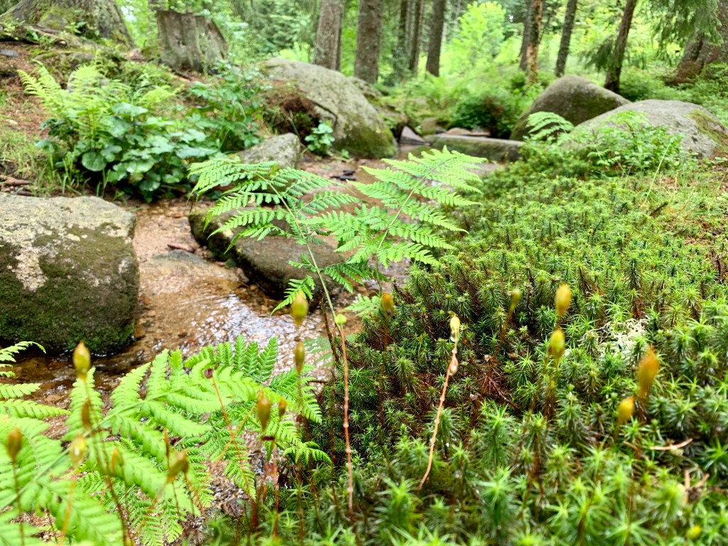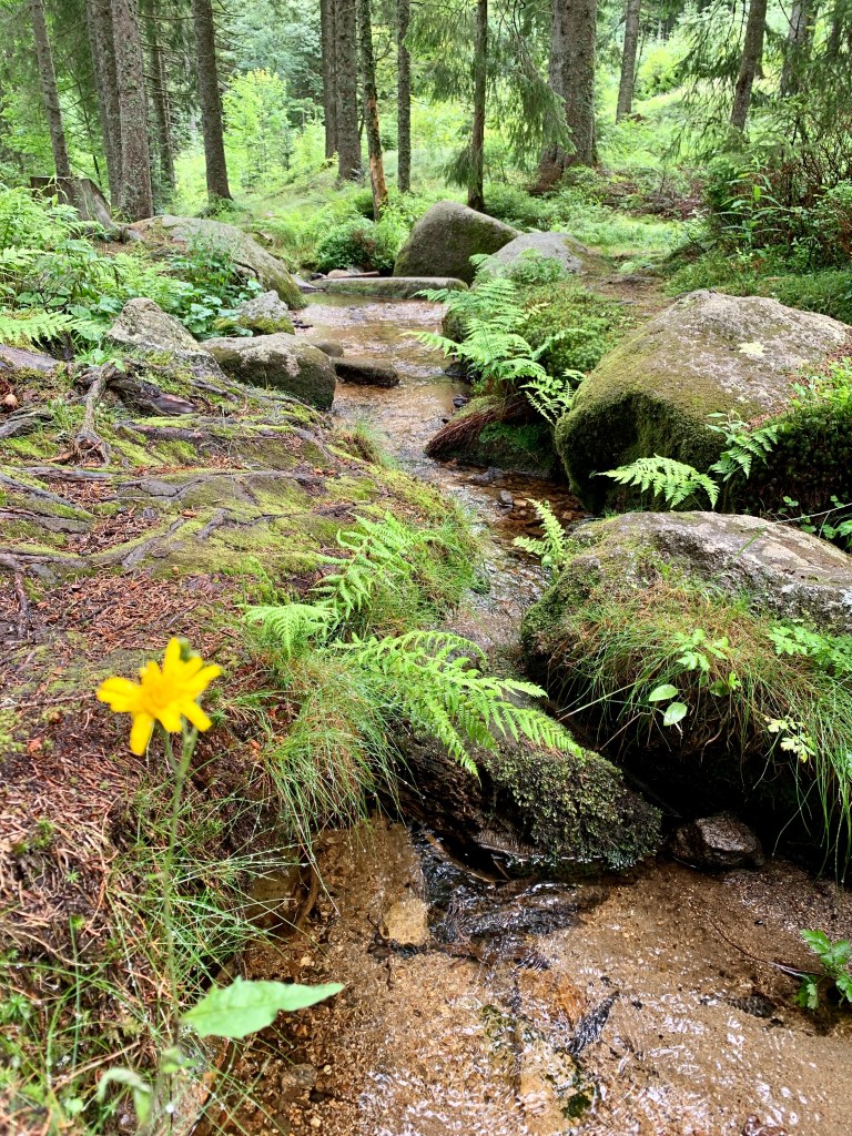 Der Regen hatte sich nach etwa einer Stunde an der Elzquelle dann auch schon wieder erledigt, so dass wir dort im regennassen Wald unseren selbst gebrauten schwarzen Kaffee trinken und hübsch dem sprudelnden Wasser zukucken konnten. Das hatte doch was sehr Beruhigendes – wenn man mal vom vorbeiziehenden Westweg-Wanderer-Strom absieht, der in den letzten Tagen noch etwas dichter geworden ist. Ständig trifft man dieselben Menschen – was ja aber tatsächlich auch ganz nett ist, weil man vom einen ein Hotelzimmer erbt (weil der umgeplant hat), dem anderen mit Blasenpflaster aushilft (weil die Schuhe zu klein oder neu sind) oder einfach nur dasteht und über Gott und die Welt quatscht (die Leute erzählen schon tolle Geschichten!).
