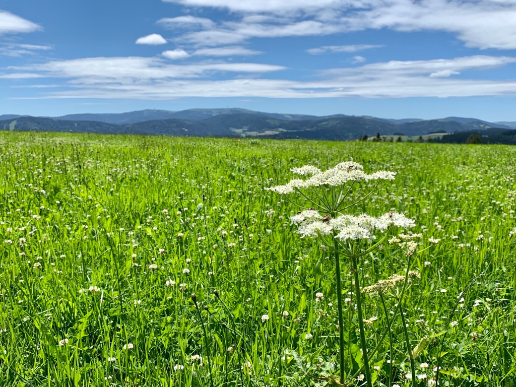 Heute war das Wetter dann wieder strahlend, so dass wir schon ziemlich früh am Tag den Feldberg in der Ferne sahen, der morgen mein Ziel sein wird. Ansonsten zeigt sich die Südschwarzwälder Landschaft offener und weniger bewaldet als im Norden. Verstreut ducken sich Bauernhöfe an den Hügeln, und überall grasen süßestens Ziegen und Kühe.