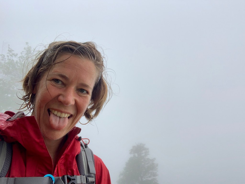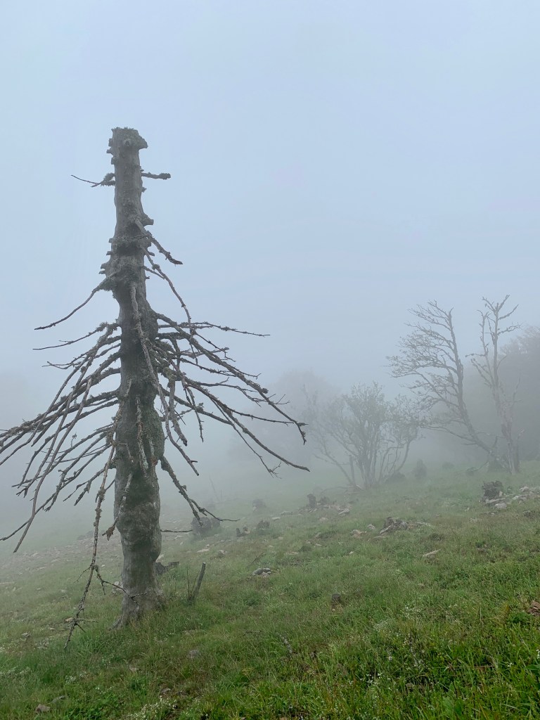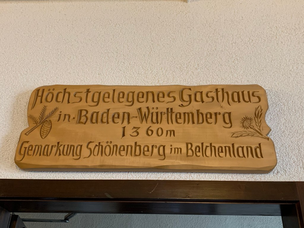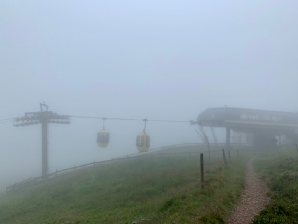 Oben war komplett Nebel um uns, so dass wir uns das letzte Wegstückchen auf den Gipfel sparten und lieber gleich im höchstgelegenen Gasthaus Baden-Württembergs auf einen Cappuccino und ein Sahneschnittchen einkehrten.