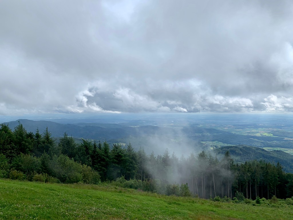 Heute ging es erst einmal über die letzten Schwarzwaldhöhen (die Berge Belchen und Blauen) nach Kandern. Mit 35 Kilometern und über 1.000 Höhenmetern meine bisherige Königsetappe – was die Zahlen angeht. Wettertechnisch war kein König zu sehen. Der Wald war voll von umherziehenden Wolken- und Nebelgeschwadern, oft regnete es, und von den Höhen herab sah man nichts bis nur sehr wenig. Erst nachmittags beim Abstieg nach Kandern zeigte sich die Sonne.