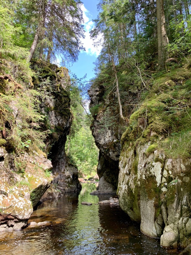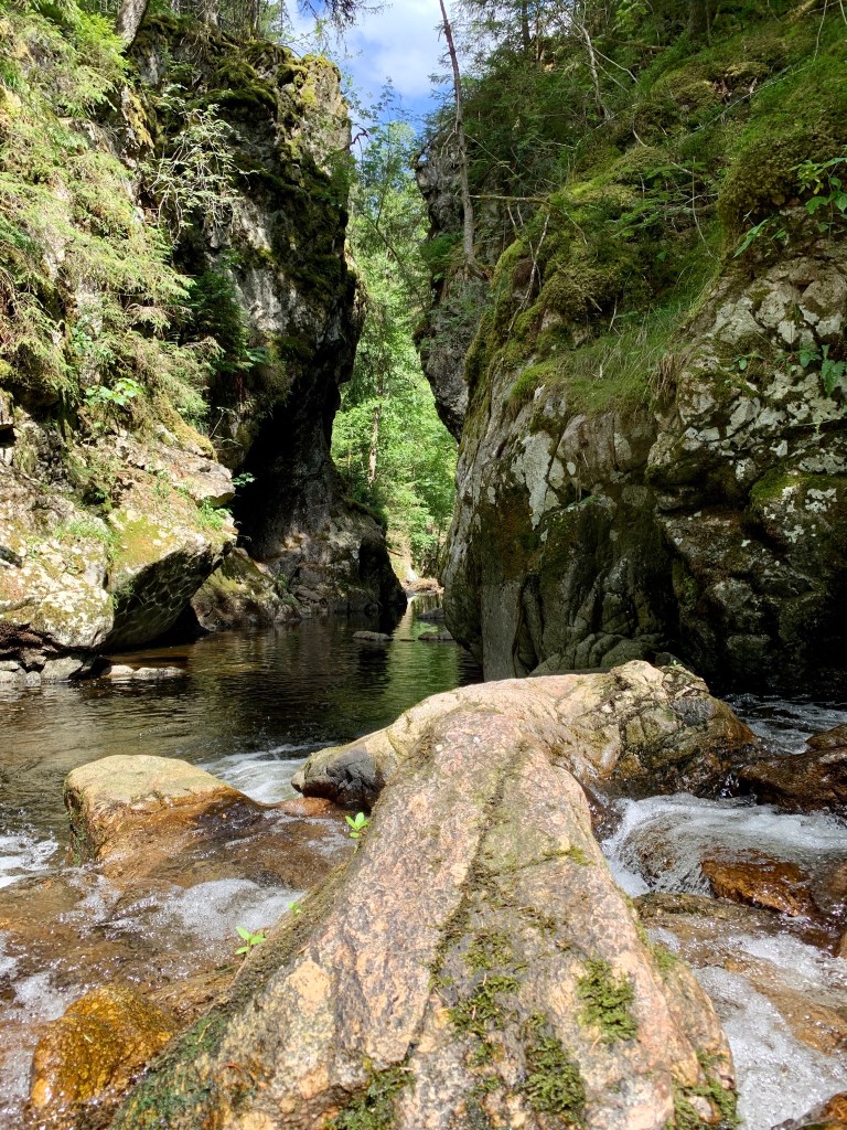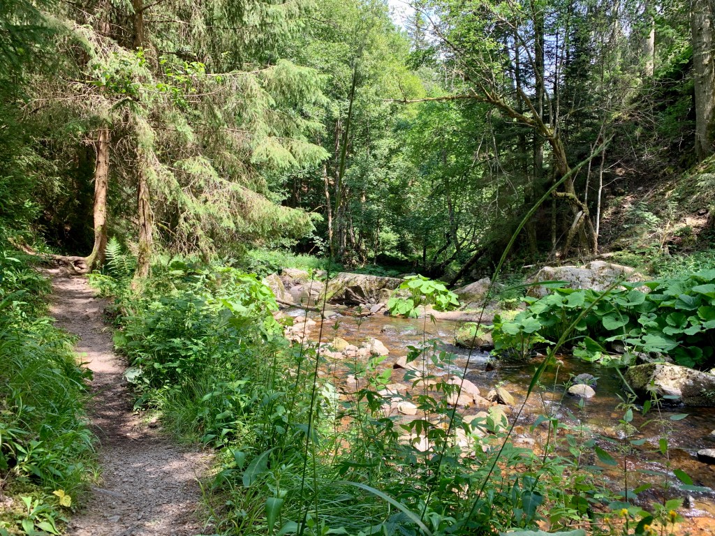 Wenig später tauchten wir ein in die Welt der Schwarzwälder Schluchten. Erst stießen wir auf das Flüsschen Haslach, das wenig später in die Wutach mündete. Der Weg machte dem Schluchtensteig (dem ich jetzt zeitweise folge) alle Ehre, war steigig und schluchtig, auch wurzelig und steinig und ging prächtig auf und ab. Dazwischen gabs Fotomotive und entspannende Fußbäder for free. Ich sag‘s gerne mal wieder: HERR-LICH!