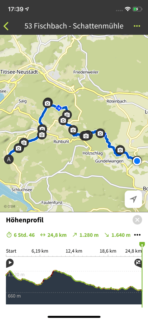 Wie dem auch sei! Frau Komoot zeigte sich erst recht unnachgiebig und gab vor: 25 Kilometer zur Schattenmühle in der Wutachschlucht, und nein, nicht auf direktem Weg, sondern nochmal luftig über die Schwarzwälder Höhen. Die von Frau Komoot im Endergebnis angegeben 1.280 Hm rauf und 1.640 Hm runter sind allerdings etwas übertrieben, um nicht zu sagen, das Blaue vom Schwarzwälder Himmel herunter gelogen. So dann doch nicht!