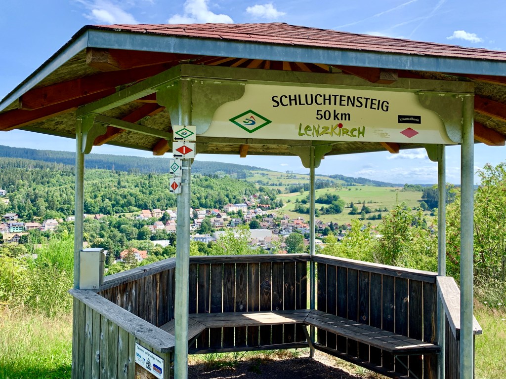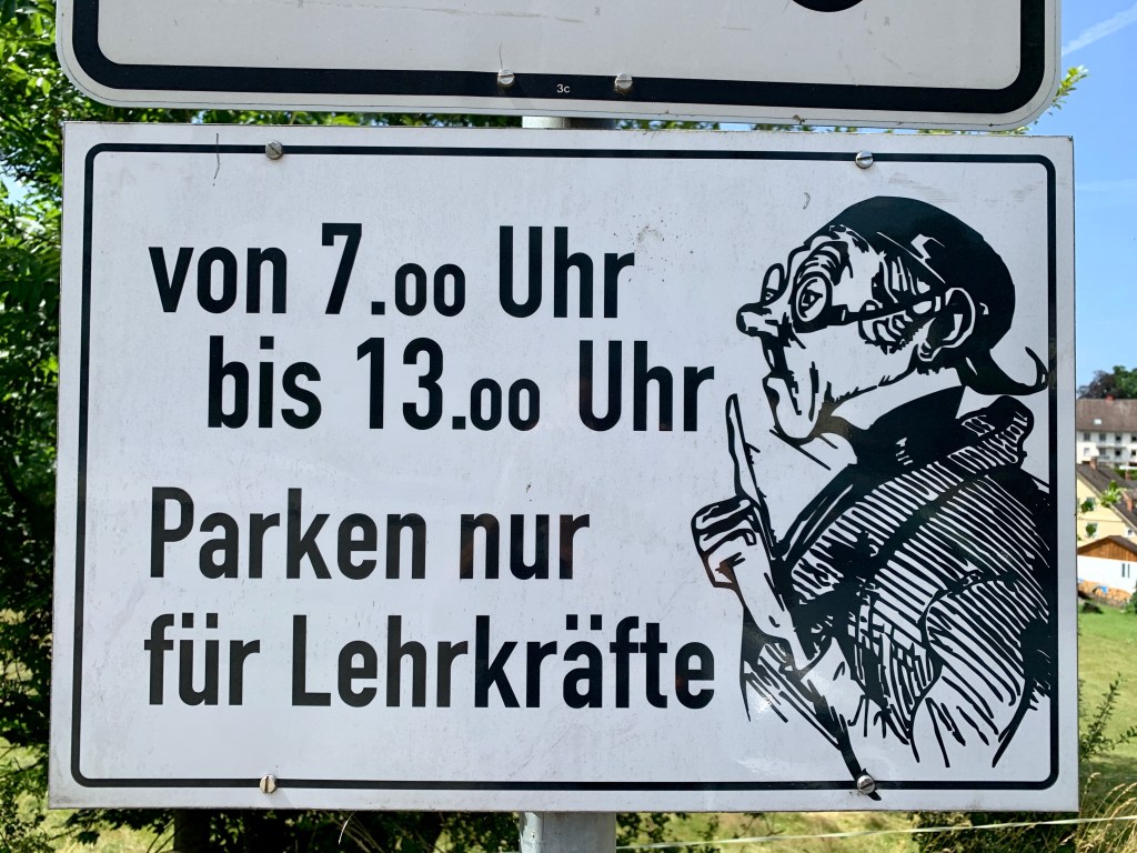 Nach sechs Kilometern erreichte ich Lenzkirch, was außer einem Schluchtensteig-Aussichtspavillon nicht wirklich viel zu bieten hat. Oder doch … ein bemerkenswertes Schild! Man braucht sich über das schlechte Image von Lehrerinnen und Lehrern nicht wundern, wenn vor Schulen SOLCHE Schilder hängen. Da möchte man über die Qualität des dortigen Unterrichts gar nicht erst nachdenken… (gelb-blaues Aufjaul-Emoji!)