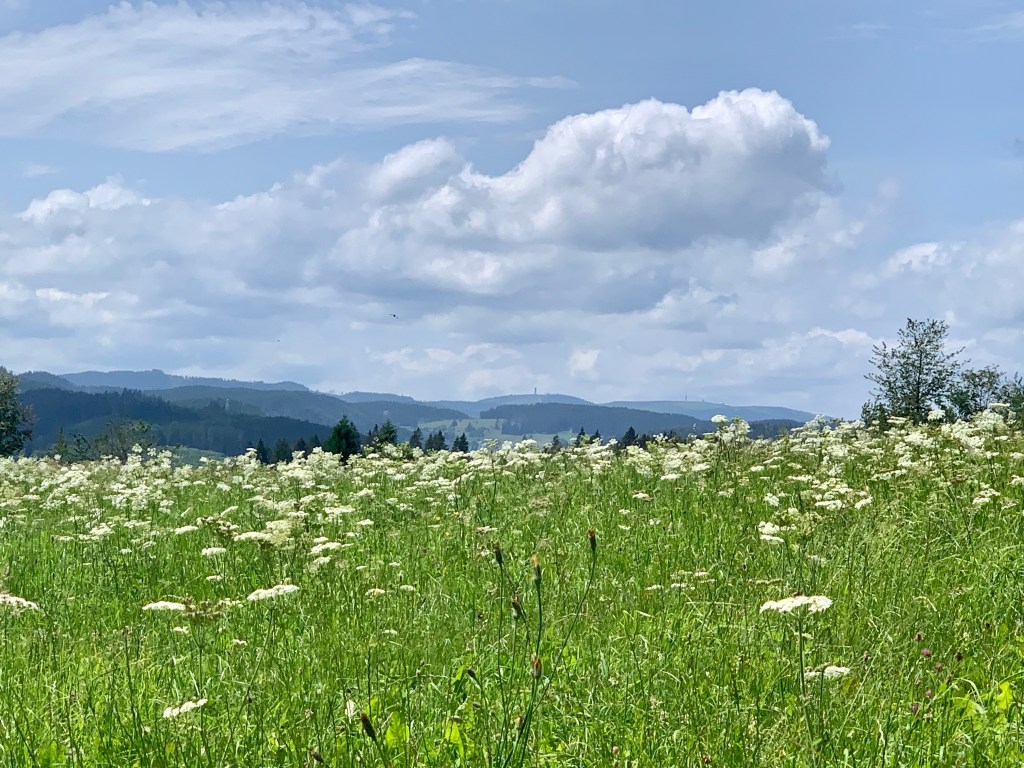 Also: Hinein in den Wald und (vielleicht ein letztes Mal) hinauf auf die Höhen, wo ich daselbst eine vorzügliche Hütten-Füße-hoch-Pause machte. Als ich dann beim Weiterwandern aus dem Wald trat, sah ich einerseits zurück Richtung Hochschwarzwald, andererseits Richtung Osten, wo der Schwarzwald in die Baar übergeht. Die Baar (vorher nie gehört, auch gerade erst gelernt), so heißt die Hochebene zwischen Schwarzwald und Schwäbischer Alb, durch die ich dann ab spätestens übermorgen wandern werde.