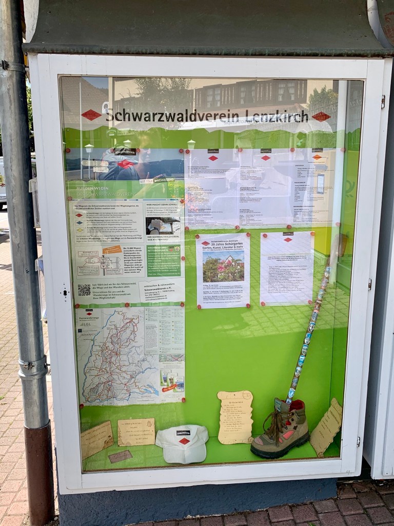 Vor dem einzig schönen Haus, dem Rathaus, parkte ein LKW und verhinderte meine Touristen-Fotografiererei. Ich wandte mich stattdessen dem Info-Kasten des Schwarzwald-Vereins zu. Wer am nächsten Sonntag noch nichts vorhat, kann an einer Nacktfrosch-Wanderung (?) teilnehmen. Treffpunkt: 10 Uhr hier am Info-Kasten. Des Weiteren können zu den Bürozeiten des Vereins Holzbrettchen mit sinnigen Sprüchen erworben werden. Leute, ich sag‘s euch: Der Schwarzwald-Verein-Sprüche-Schnitzer weiß Bescheid! Da ist viel Wahres dran!