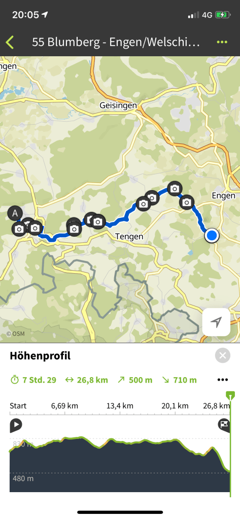 Da für heute Nacht in Engen, dem offiziell nächsten Etappenziel, keine Unterkunft zu bekommen war, musste ich 5 km hinter Engen, in Welschingen, ein Fremdenzimmer im Gasthof Adler buchen. Das machte die Etappe zu einer extrem langen, doch mithilfe einer sehr kooperativen Frau Komoot haben wir sie ebenso großzügig wie geschmeidig auf dann 27 Kilometer verkürzt. (Engen ließen wir links liegen…)