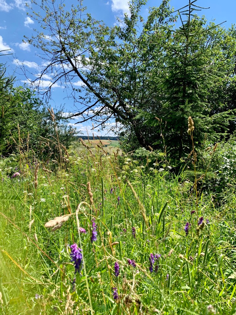 Der Weg zeigte sich fortan wunderbar bergpfadig – im Gegensatz zu schotterwegig oder teerstraßig – und war zwischenzeitlich auch mal uneins mit Frau Komoot, so dass ich mich durch mannshohes Gras schlagen musste.