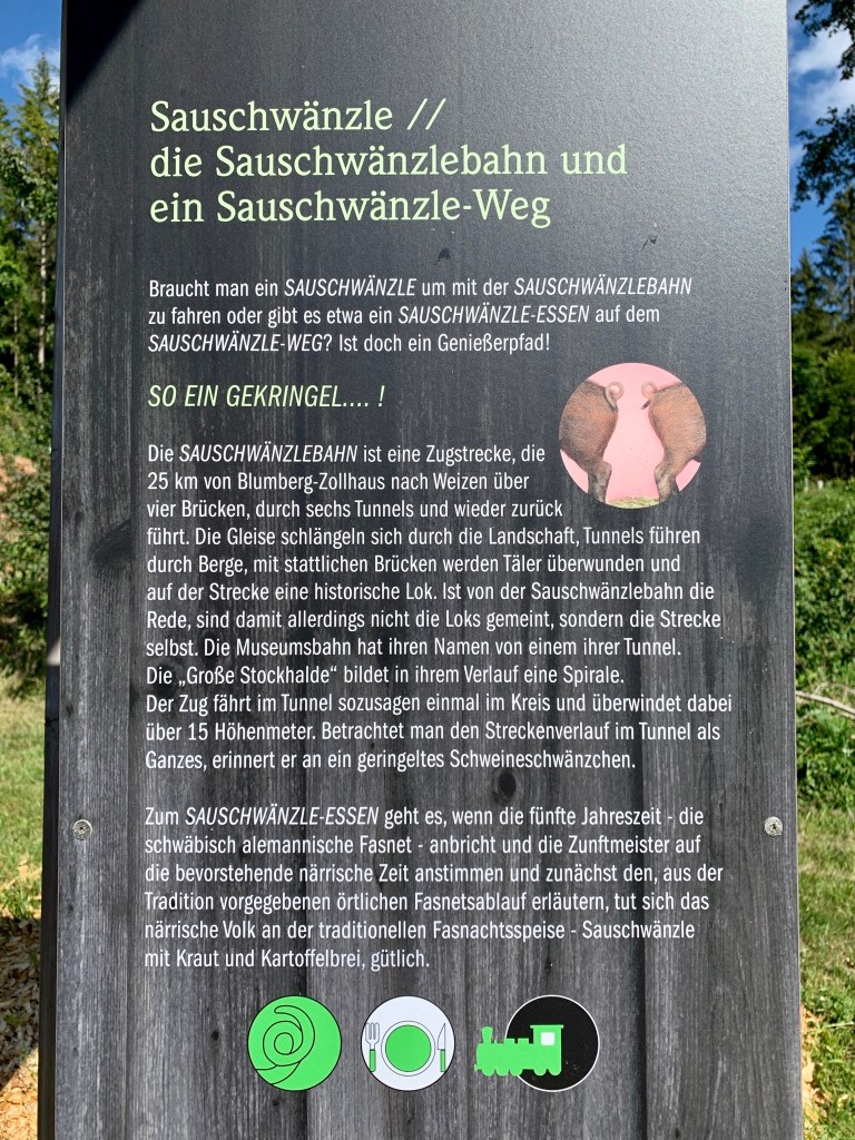 Erstes Highlight: Die Sauschwänzlebahn, eine historische Museumsbahn, die sich dem Kringelschwänzchen eines weiblichen Schweins gleich die Berge hinaufwindet. Schweinehund fand‘s natürlich zuckersüß und lauerte an der Strecke auf das Vorbeidampfen des Bähnchens. Silke und somit die Fotografin hat sie leider verpasst, weil sie sich mit einer entgegenkommenden E1-Wanderin verquatscht hat – endlich mal wieder eine! Anna, alles Gute auf deinem Weg Richtung Norden!