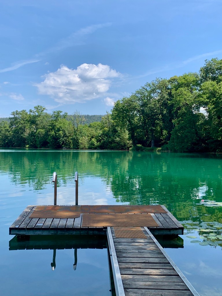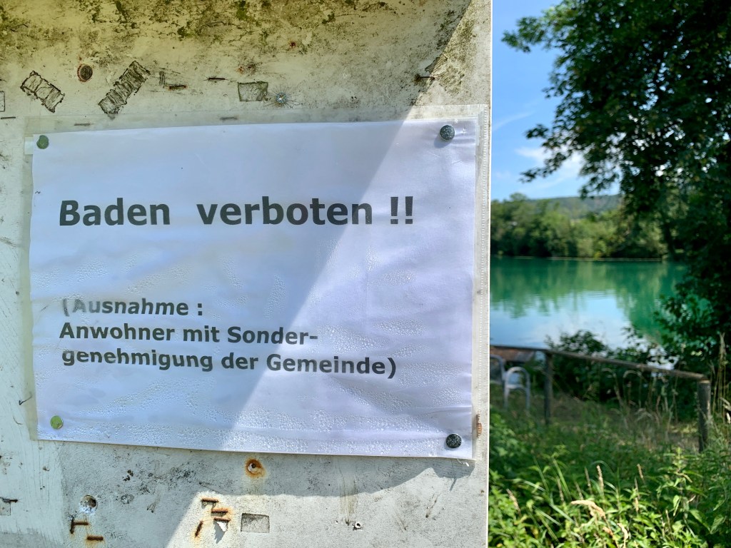 Frau Komoot konnte uns nur mit Mühe zum Weiterwandern (das IST derzeit aber auch ein motivationsloser Haufen!) bewegen und hatte Erfolg, indem sie mit dem Steißlinger See lockte. Der lag dann auch entzückendst grünblau in der Mittagssonne und lud mit Steg und Schwimmleiter zum Bade. Doch, ach, die Spaßfreiheit kennt keine Grenzen: Baden verboten und keine Sondergenehmigung in Sicht! (rotes, grimmiges Emoji).