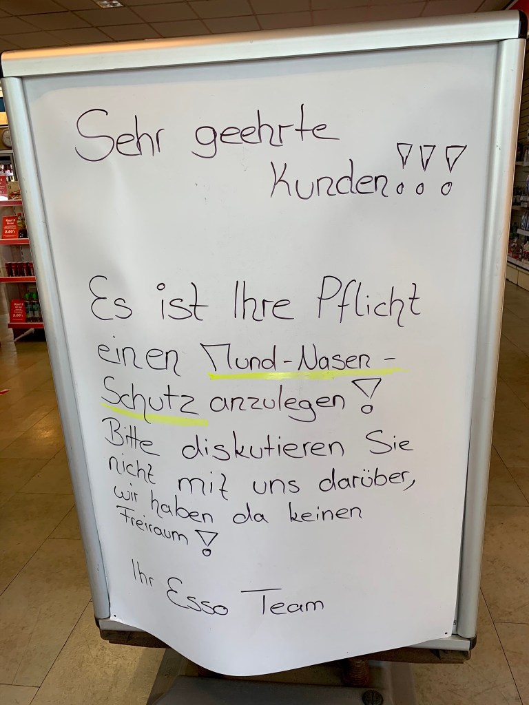 Heute Morgen in Singen besorgte ich mir – einer inneren Stimme folgend (vielen Dank, liebe innere Stimme) – in der Tanke nochmal eben was zu essen und ein paar Süßigkeiten. Und weil ich brav Mund-Nasen-geschützt war und auch nicht diskutieren wollte, ging das Ganze problemlos vonstatten. Ich möchte mir nicht ausmalen, welche Szenen zu DIESEM Schild geführt haben…