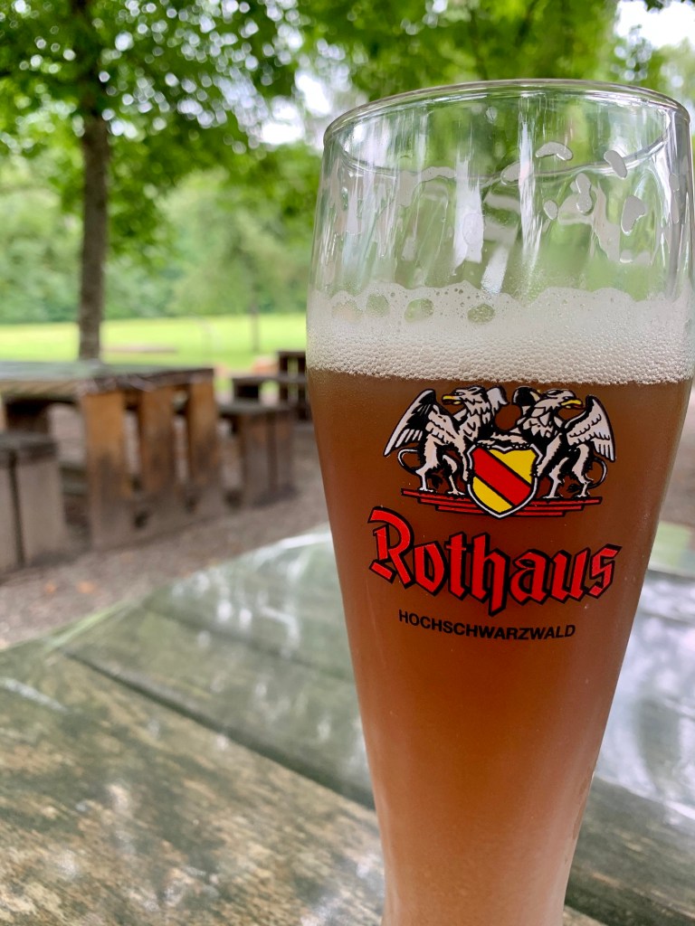 … und acht Kilometer vor dem Ziel einmal mehr Sarah und Tobias. Das freudige Wiedersehen wurde sodann auch gleich kräftig begossen – und zwar im nächsten Biergarten (St. Katharina) mit Cola-Weizen. Dieses Getränk kannte ich bisher nur vom Hören-Sagen und seinen Geschmack stellte ich mir gruseligst vor. Für alle, die‘s nicht kennen: Ja, das machen die hier wirklich: Sie mischen Cola und Weizenbier zu einem farblich gesehen eher fragwürdigen Gebräu. Angeblich ein eins-a-Wandertrunk, weil Elektrolyte und so, und es schmeckte jetzt auch nicht GANZ fürchterlich, aber eben doch nach Cola und Weizen und ganz schön süß. Da lob ich mir doch meine Weißweinschorle …