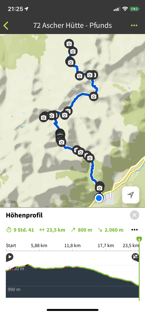 Ich war mittlerweile fast fünf Stunden ohne nennenswerte Pause unterwegs und hatte gerade mal knapp die Hälfte der Strecke hinter mich gebracht. Schweinehund war extrem Pausen-reif! Also genehmigte ich uns erst mal ein Sahneschnittchen in Form von Kaiserschmarrn mit Apfelmus sowie zwei gespritzte Johanns (Johannisbeerschorle) und beratschlagte mit Frau Komoot über mögliche Weg-Alternativen. Doch – und da biss die Komoot-Maus keinen Faden ab – wir waren auf 2.588 Meter Höhe und Pfunds liegt auf knapp 1.000 Meter, wir mussten also 1.600 Hm runter (und nein, es gab keine Bahn).