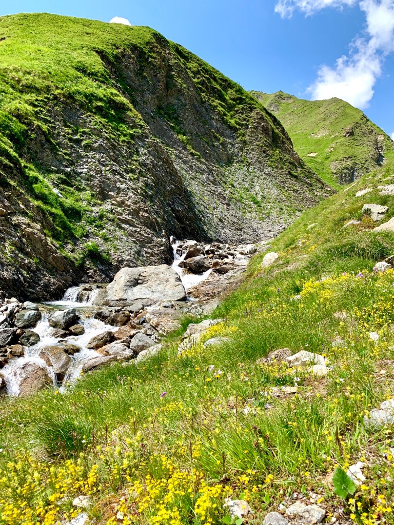 Liebe Leute, WAS für ein Weg!! Ich folgte einem munter-steil dahinströmenden Bergbach in ein immer enger und steiler werdendes schluchtartiges Bergtal, dachte erst: Ach, nett hier, danach: Oha!, später dann: Uiihh! Es war steil, es war lang, es war wild, es war einsam – aber es war saugeil!