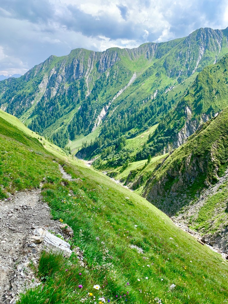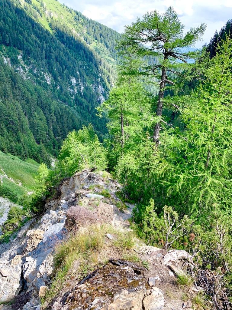 Wir schnürten also frohgemut unser Bündel, marschierten an allerlei Berggewässer vorbei und bogen hinter der letzten Bergbahn-Station (Schigebiet ade!) auf einen steil nach unten führenden Bergsteig ein. Oben am Schild stand: Pfunds 4 Stunden – Trittsicherheit und Schwindelfreiheit notwendig. Uiihh…!