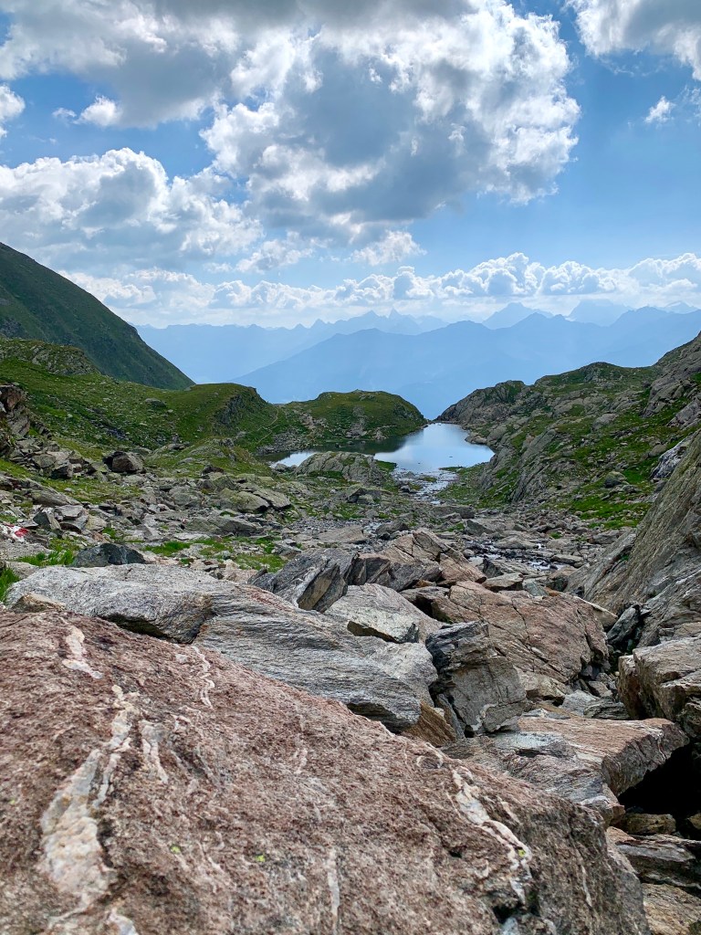 Danach hüpfte ich quer über Geröllfelder hinauf zur Furglerscharte, von wo aus ich den sicherlich großartigen Furgler hätte besteigen können. Dass ich es nicht getan habe, zumal bei perfektem Wanderwetter, halten viele Bergsteigerlein wahrscheinlich für ziemlich bedauernswert, aber ich bin ja (wie gelesen) kein Gipfelmensch und strebte gestern eh nach Weiterem, hatte also keine Zeit für Gipfel.