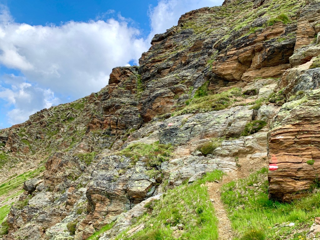 Früher Vogel fängt ja bekanntlich die lange Etappe und so startete ich – Schweinehund hin oder her – um 10 vor acht. Der Weg führte zunächst (fast Schigebiets-los) hinauf auf ein Jöchel – was ganz Neues – schwupp, über ein Schneefeld und dann schön drahtseilversichert entlang des Abgrunds, was sich (das für alle Mütter) deutlich gefährlicher liest als es war.