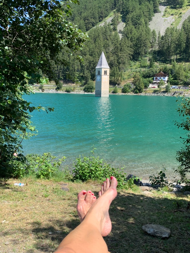 Heute geht’s schon wieder tiptop, und trotzdem genieße ich den Füße-hoch-Tag am Reschensee (schon mal ein kleiner Auto-Spritztour-Vorgriff – zu Fuß werde ich erst morgen und übermorgen hier sein), während der Bruder sich zur Vorbereitung seiner Trans-Alp-Mountainbike-Tour in den Bergen tummelt.